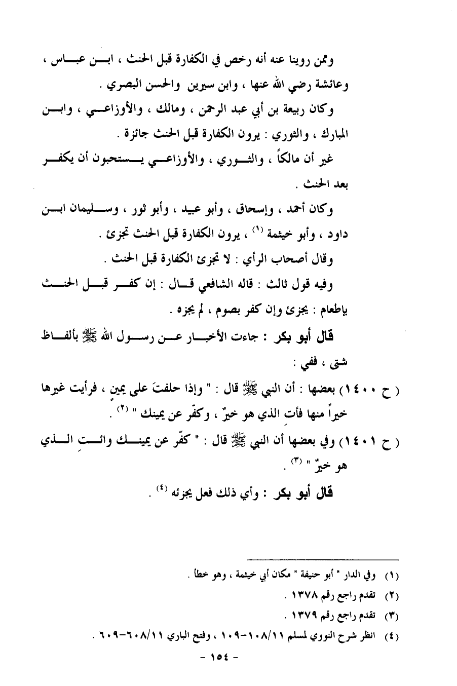(ح 1401) وفي بعضها أن النبي - صلى الله عليه وسلم - قال: "كفّر عن يمينك وانتِ الذي هو خيرٌ".