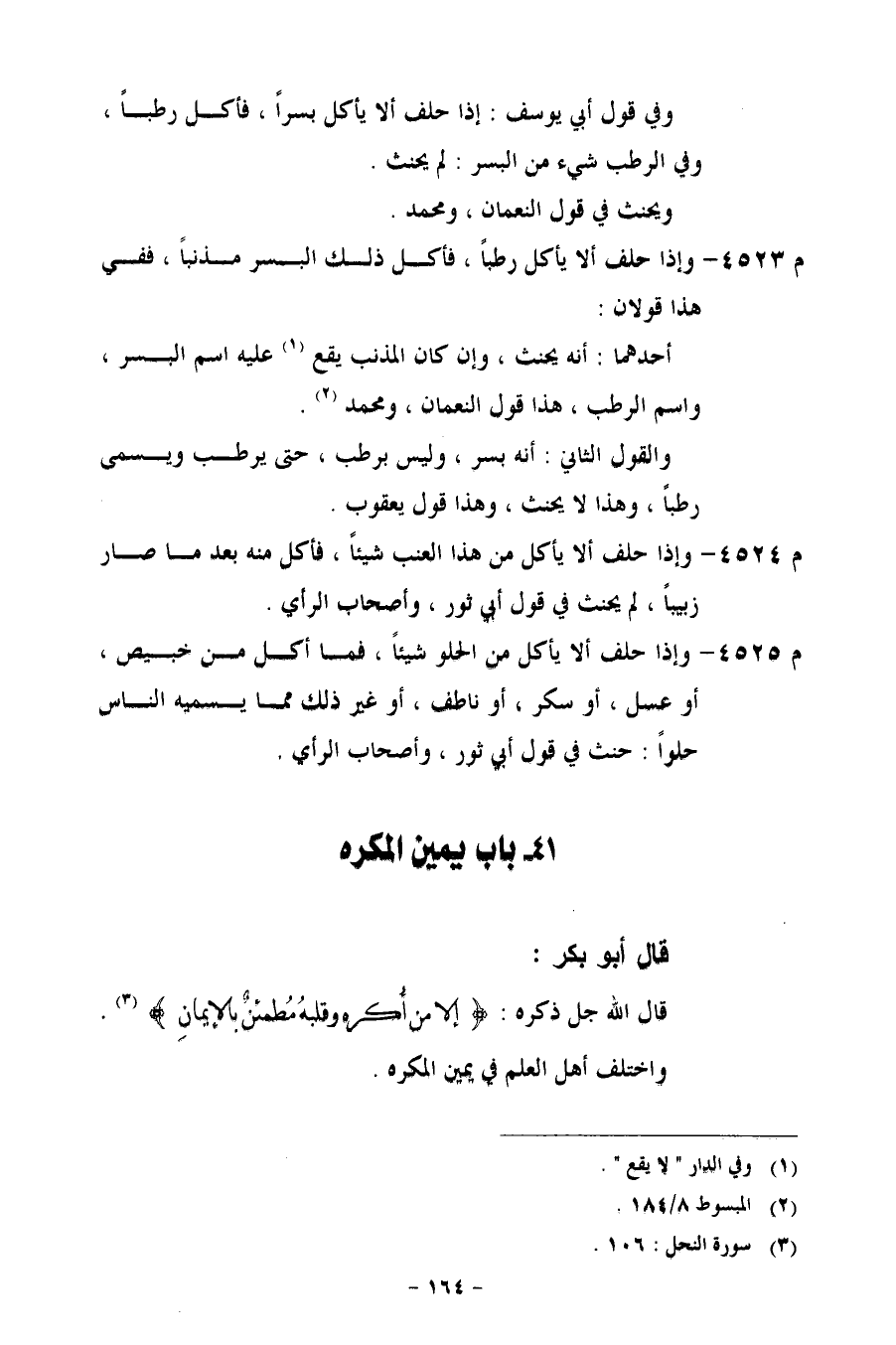 م 4525 - وإذا حلف ألا يأكل من الحلو شيئاً، فما أكل عن خبيص، أو عسل، أو سكر، أو ناطف، أو غير ذلك مما يسميه الناس حلواً: حنث في قول أبي ثور، وأصحاب الرأي.
