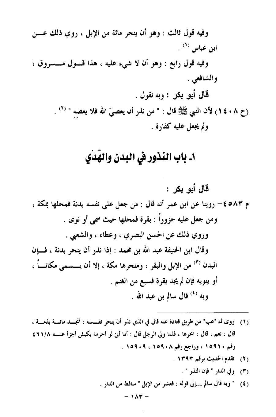 م 4583 - روينا عن ابن عمر أنه قال: من جعل على نفسه بدنة فمحلها بمكة، ومن جعل عليه جزوراً: بقرة فمحلها حيث سمى أو نوى.