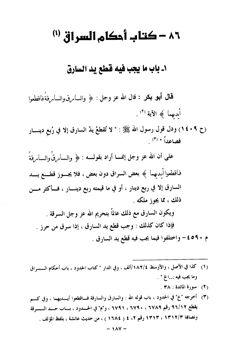 على أن الله عَزَّ وَجَلَّ إنما أراد بقوله: {وَالسَّارِقُ وَالسَّارِقَةُ فَاقْطَعُوا أَيْدِيَهُمَا} بعض السراق دون بعض، فلا يجوز قطع يد السارق إلا في ربع دينار، أو في ما قيمته ربع دينار، فأكثر من ذلك، مما يجوز ملكه.