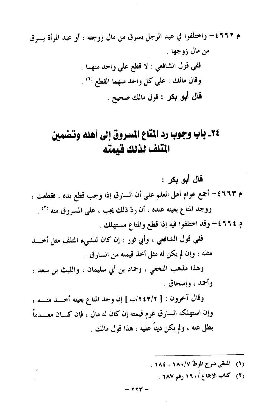 م 4663 - أجمع عوام أهل العلم على أن السارق إذا وجب قطع يده، فقطعت، ووجد المتاع بعينه عنده، أن ردّ ذلك يجب، على المسروق منه.