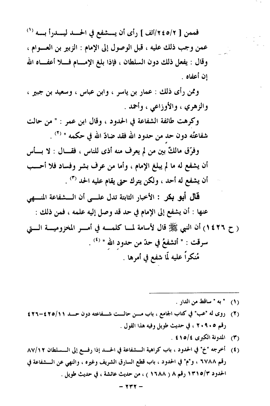 وكرهت طائفة الشفاعة في الحدود، وقال ابن عمر: "من حالت شفاعتُه دون حدٍ من حدود الله فقد ضادّ الله في حكمه".
