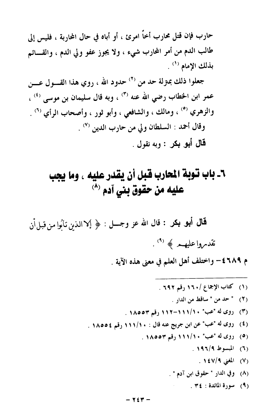 6 - باب توبة المحارب قبل أن يقدر عليه، وما يجب عليه من حقوق بني آدم (¬2)