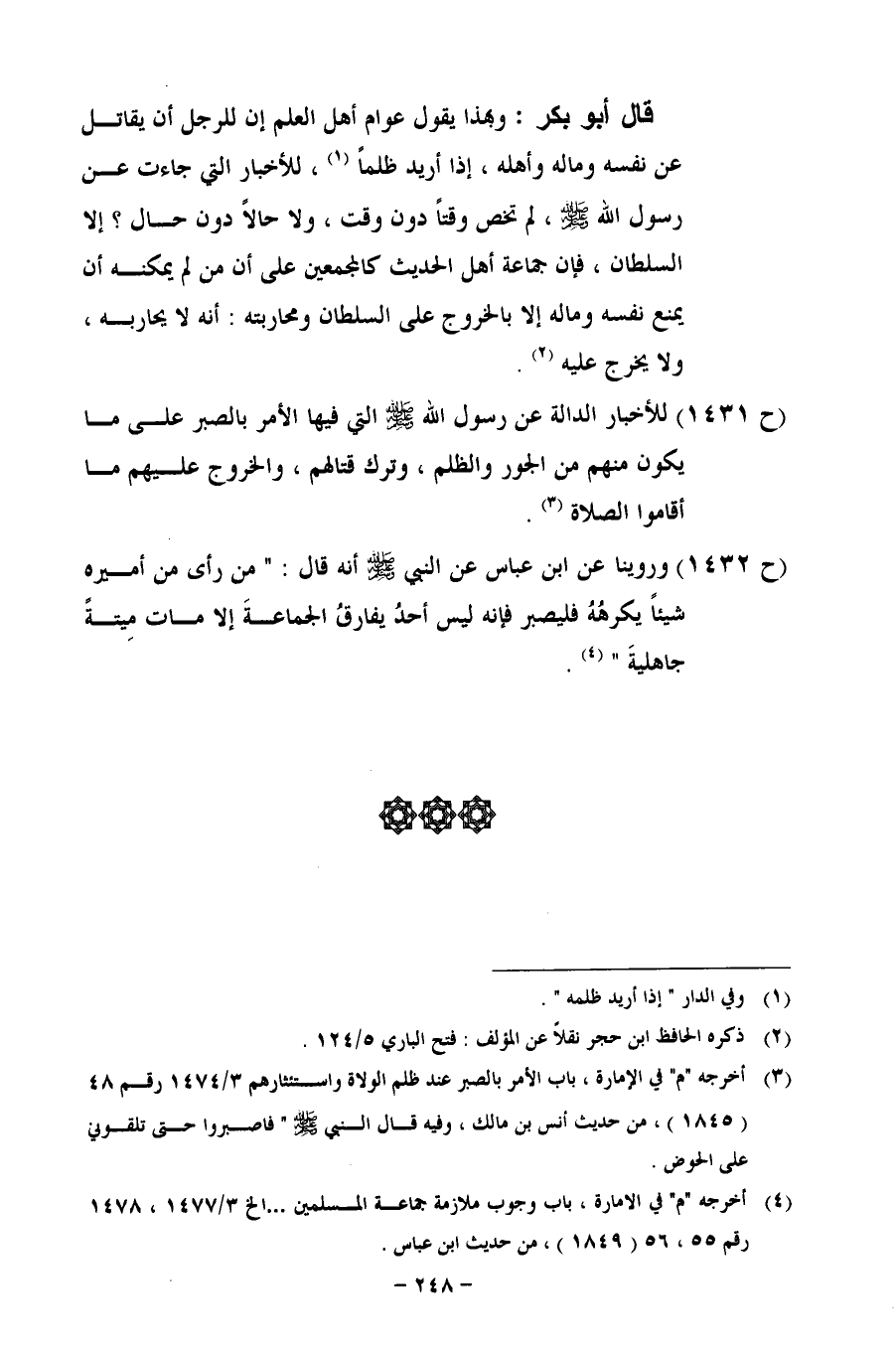 (ح 1432) وروينا عن ابن عباس عن النبي- صلى الله عليه وسلم - أنه قال: "من رأى من أميره شيئاً يكرهُهُ فليصبر فإنه ليس أحدُ يفارقُ الجماعةَ إلا مات ميتةً جاهليةَ".