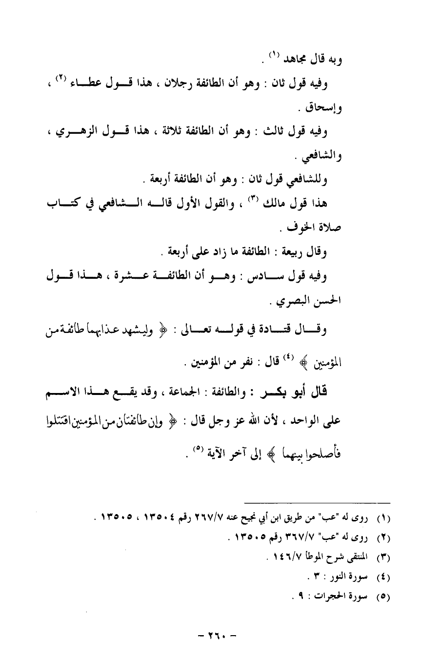 قال أبو بكر: والطائفة: الجماعة، وقد يقع هذا الاسم على الواحد، لأن الله عَزَّ وَجَلَّ قال: {وَإِنْ طَائِفَتَانِ مِنَ الْمُؤْمِنِينَ اقْتَتَلُوا فَأَصْلِحُوا بَيْنَهُمَا} إلى آخر الآية.