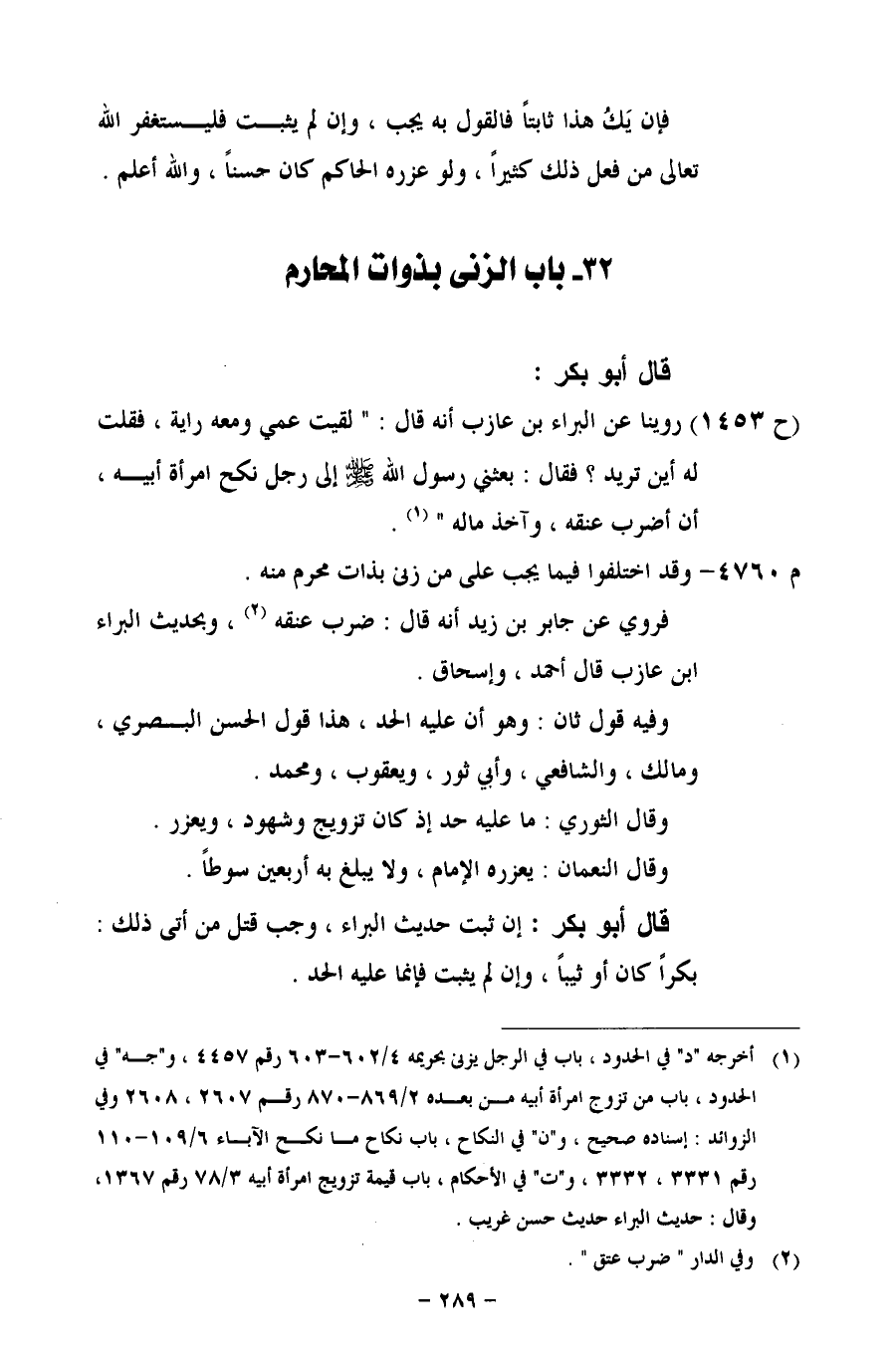 (ح 1453) روينا عن البراء بن عازب أنه قال: "لقيت عمي ومعه راية، فقلت له أين تريد؟ فقال: بعثني رسول الله- صلى الله عليه وسلم - إلى رجل نكح امرأة أبيه، أن أضرب عنقه، وآخذ ماله".