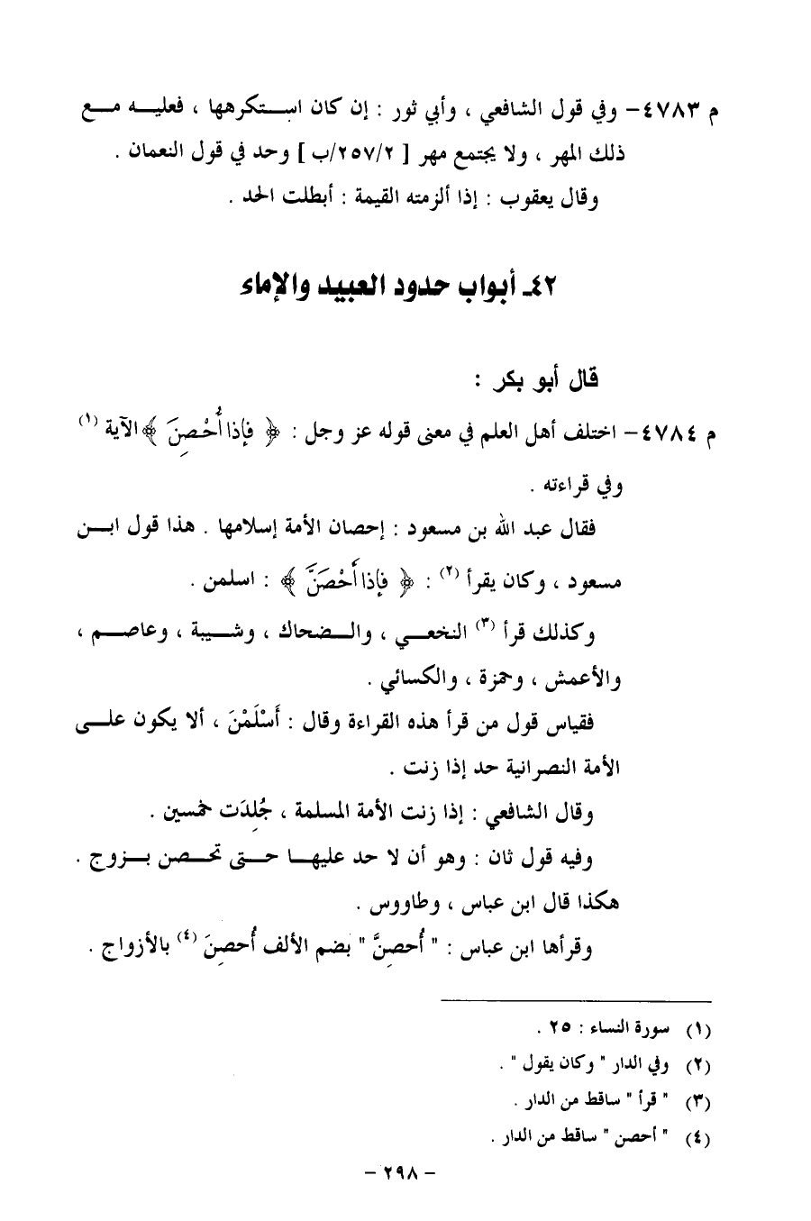 م 4784 - اختلف أهل العلم في معنى قوله عز وجل: {فَإِذَا أُحْصِنَّ} الآية وفي قراءته.