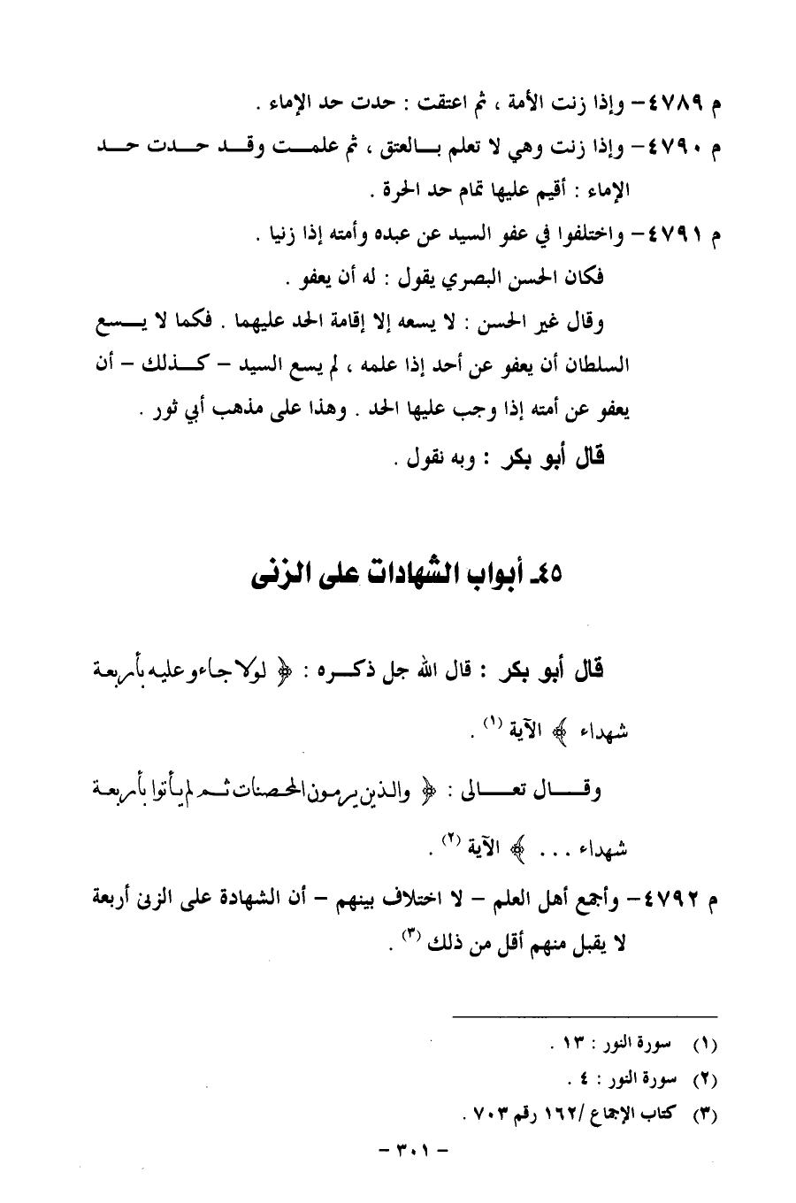 م 4792 - وأجمع أهل العلم- لا اختلاف بينهم- أن الشهادة على الزني أربعة لا يقبل منهم أقل من ذلك.