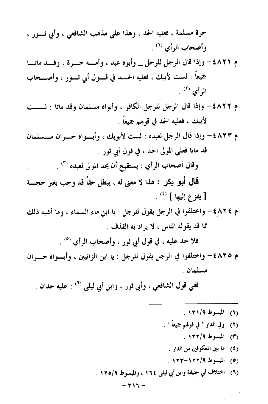 م4821 - وإذا قال الرجل للرجل وأبوه عبد، وأمه حرة، وقد ماتا جميعاً: لست لأبيك، فعليه الحد في قول أبي ثور، وأصحاب الرأي (¬1).