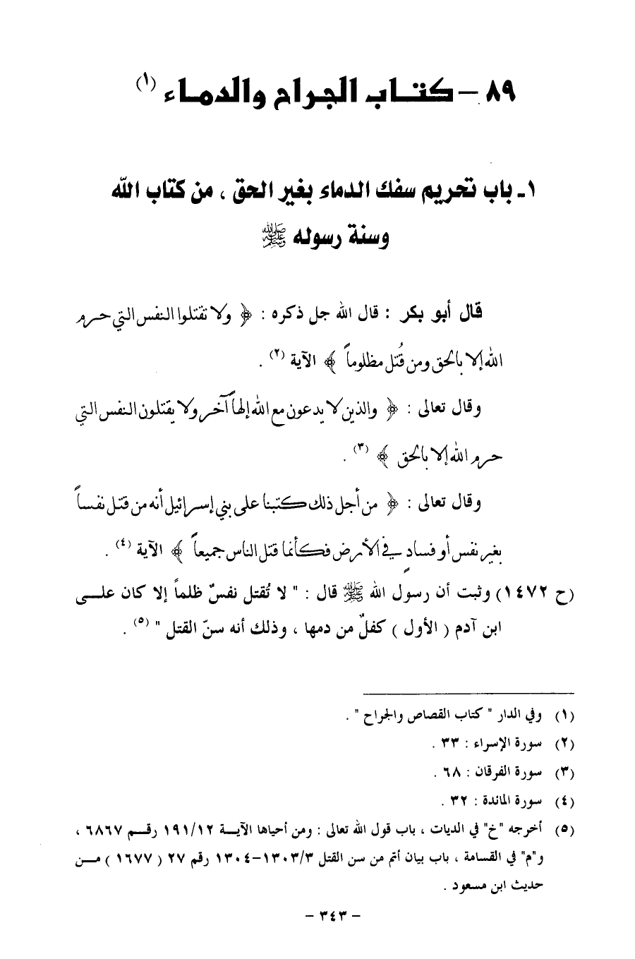 1 - باب تحريم سفك الدماء بغير الحق، من كتاب الله وسنة رسوله - صلى الله عليه وسلم -