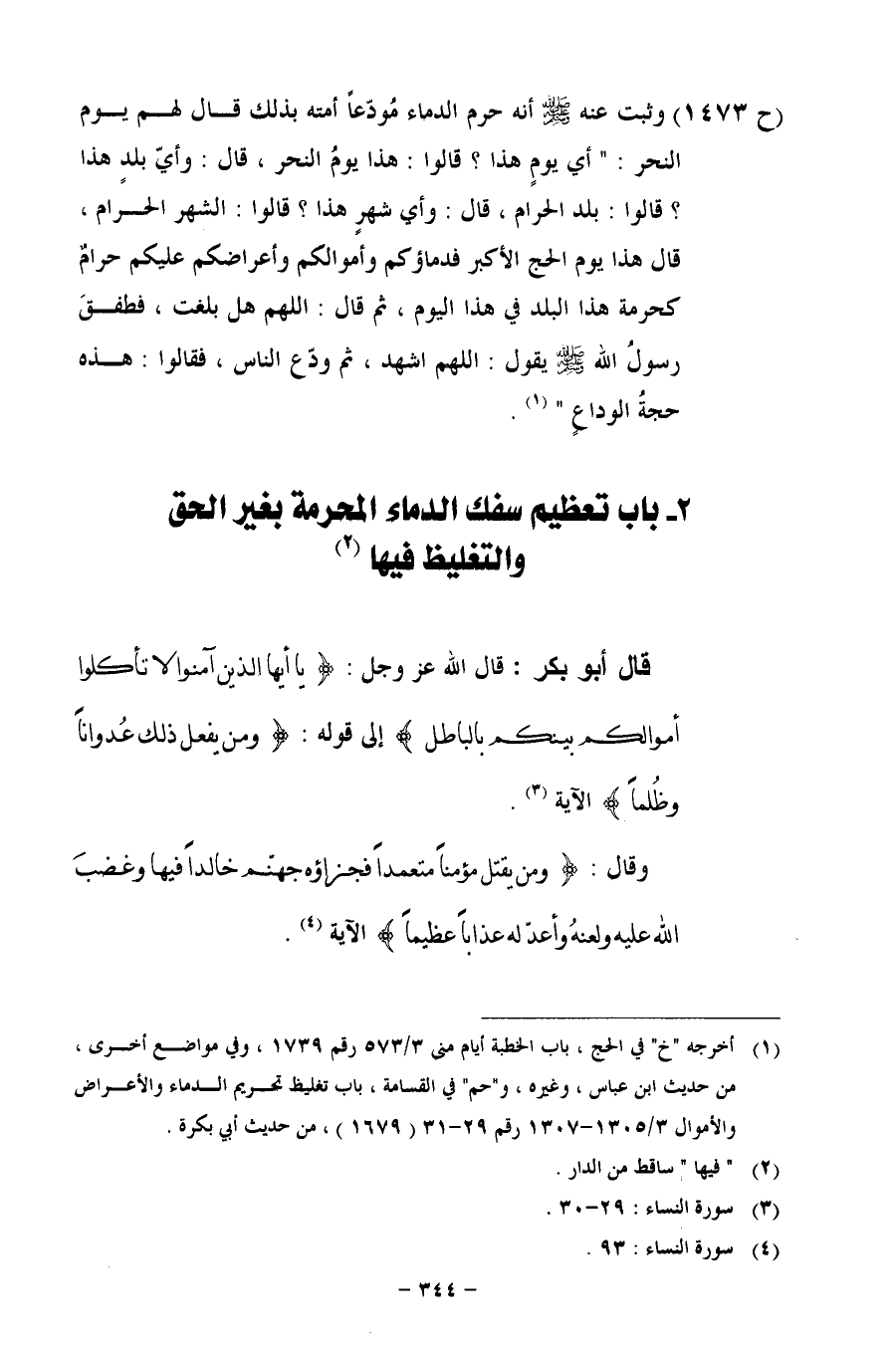 (ح 1473) وثبت عنه - صلى الله عليه وسلم - أنه حرم الدماء مُودّعاً أمته بذلك قال لهم يوم النحر: "أي يومٍ هذا؟ قالوا: هذا يومُ النحر، قال: وأيّ بلدٍ هذا؟ قالوا: بلد الحرام، قال: وأي شهرٍ هذا؟ قالوا: الشهر الحرام، قال هذا يوم الحج الأكبر فدماؤكم وأموالكم وأعراضكم عليكم حرامٌ كحرمة هذا البلد في هذا اليوم، ثم قال: اللهم هل بلغت، فطفقَ رسولُ الله - صلى الله عليه وسلم - يقول: اللهم اشهد، ثم ودّع الناس، فقالوا: هذه حجةُ الوداعٍ".