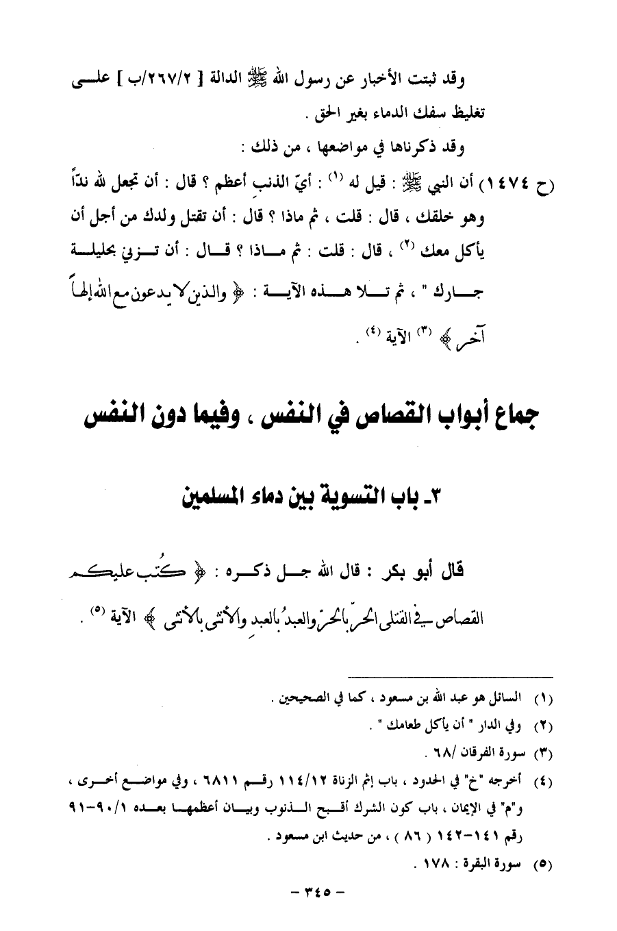 (ح 1474) أن النبي - صلى الله عليه وسلم -: قيل له: أيّ الذنبِ أعظم؟ قال: أن تجعل لله ندّاً وهو خلقك، قال: قلت، ثم ماذا؟ قال: أن تقتل ولدك من أجل أن يأكل معك (¬1)، قال: قلت: ثم ماذا؟ قال: أن تزني بحليلة جارك"، ثم تلا هذه الآية: {وَالَّذِينَ لَا يَدْعُونَ مَعَ اللَّهِ إِلَهًا آخَرَ} الآية.