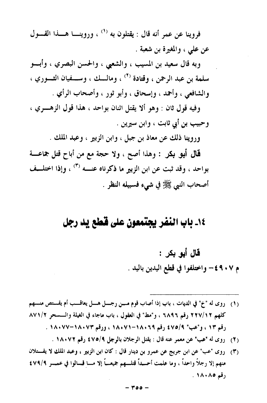 قال أبو بكر: وهذا أصح، ولا حجة مع من أباح قتل جماعة بواحد، وقد ثبت عن ابن الزبير ما ذكرناه عنه، وإذا اختلف أصحاب النبي - صلى الله عليه وسلم - في شيء فسبيله النظر.