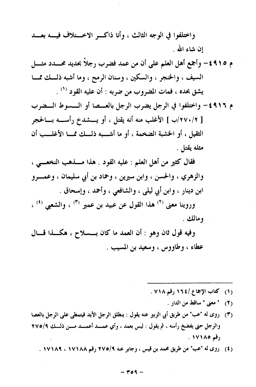 م 4915 - وأجمع أهل العلم على أن من عمد فضرب رجلاً بحديد محدد مثل السيف، والخنجر، والسكين، وسنان الرمح، وما أشبه ذلك مما يشق بحده، فمات المضروب من ضربه: أن عليه القود.