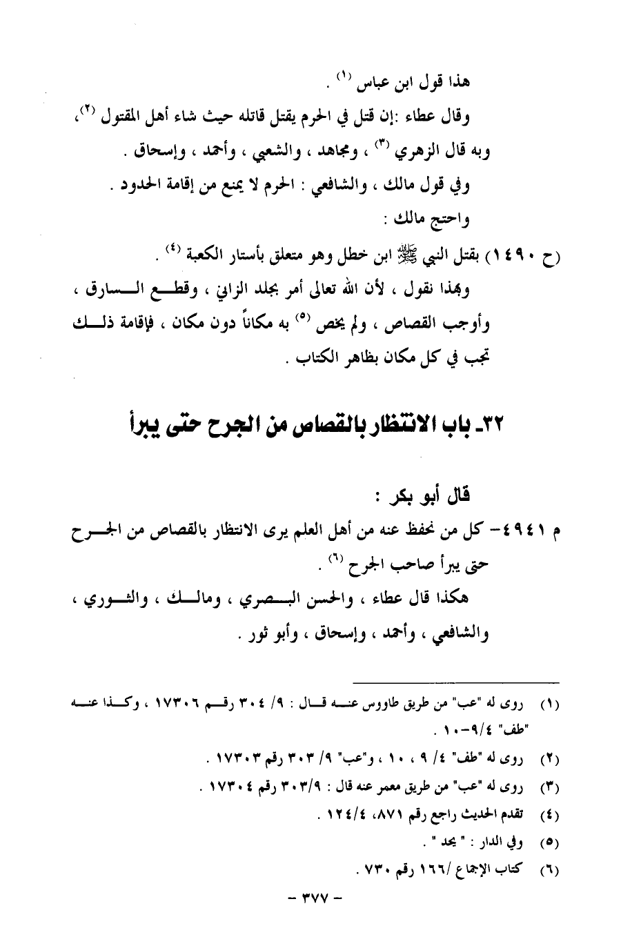 م 4941 - كل من نحفظ عنه من أهل العلم يرى الانتظار بالقصاص من الجرح حتى يبرأ صاحب الجرح.