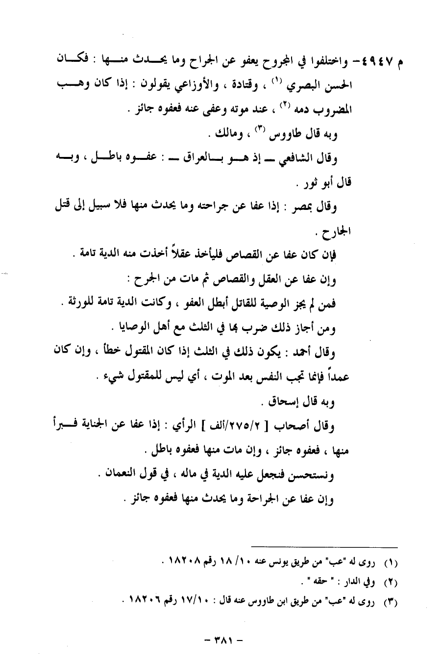 م 4947 - واختلفوا في المجروح يعفو عن الجراح وما يحدث منها: فكان الحسن البصري، وقتادة، والأوزاعي يقولون: إذا كان وهب المضروب دمه (¬1)، عند موته وعفى عنه فعفوه جائز.