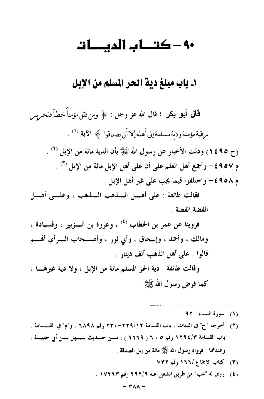(ح 1495) ودلت الأخبار عن رسول الله- صلى الله عليه وسلم - بأن الدية مائة من الإبل.