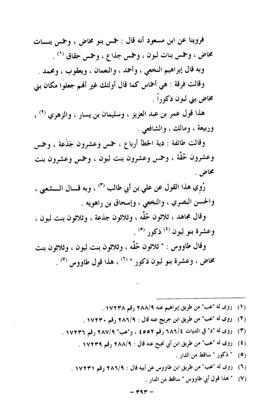 فروينا عن ابن مسعود أنه قال: خمس بنو مخاض، وخمس بنات مخاض، وخمس بنات لبون، وخمس جذاع، وخمس حقاق.