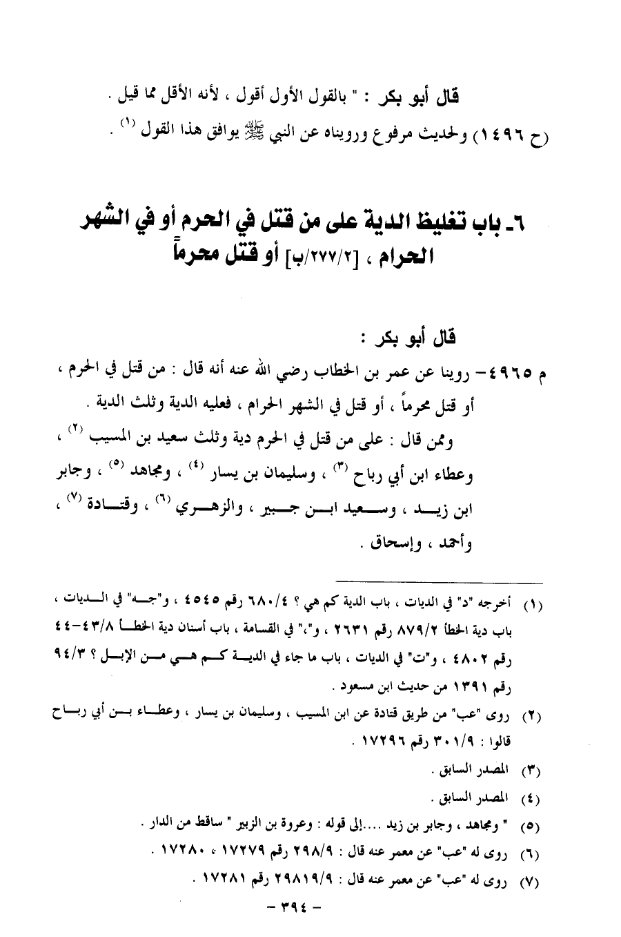 م 4965 - روينا عن عمر بن الخطاب رضي الله عنه أنه قال: من قتل في الحرم، أو قتل محرماً، أو قتل في الشهر الحرام، فعليه الدية وثلث الدية.
