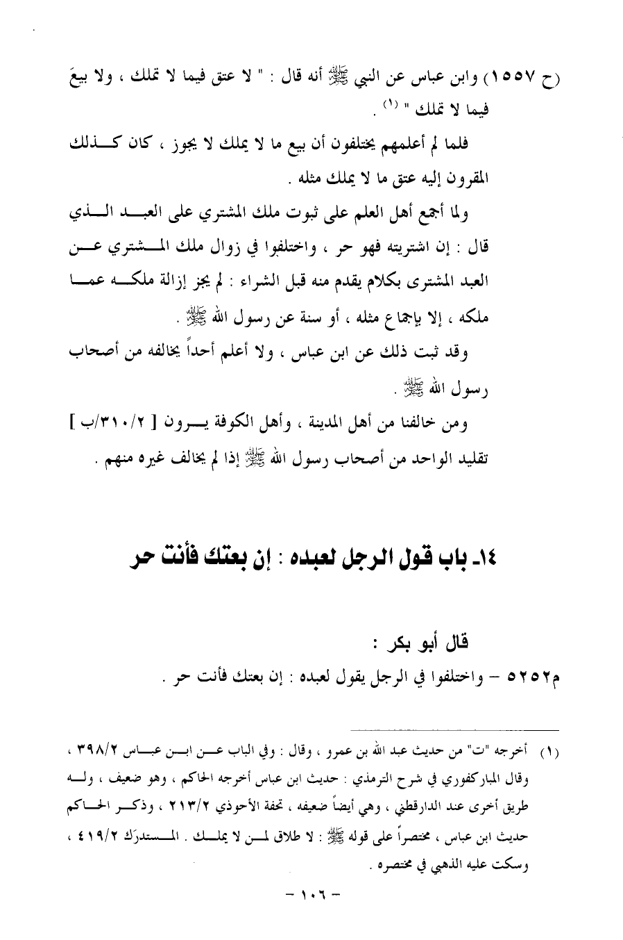 (ح 1557) وابن عباس عن النبي- صلى الله عليه وسلم - أنه قال: "لا عتق فيما لا تملك، ولا بيعَ