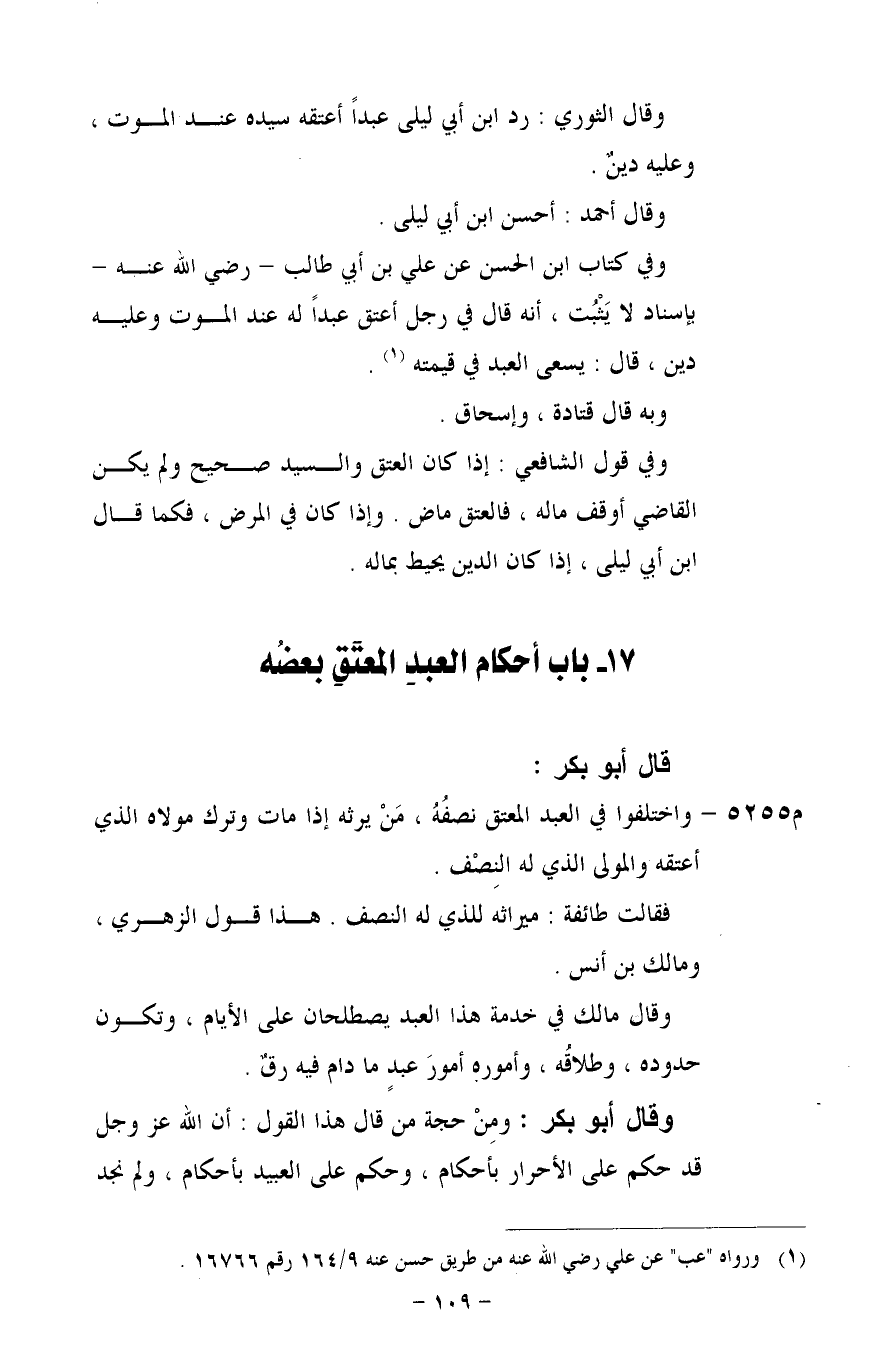 م 5255 - واختلفوا في العبد المعتق نصفُهُ، مَنْ يرثه إذا مات وترك مولاه الذي أعتقه والمولى الذي له النِصْف.