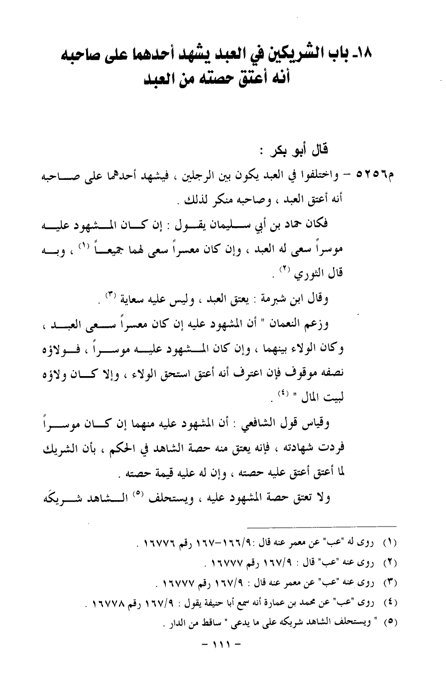م 5256 - واختلفوا في العبد يكون بين الرجلين، فيشهد أحدهما على صاحبه أنه أعتق العبد، وصاحبه منكر لذلك.