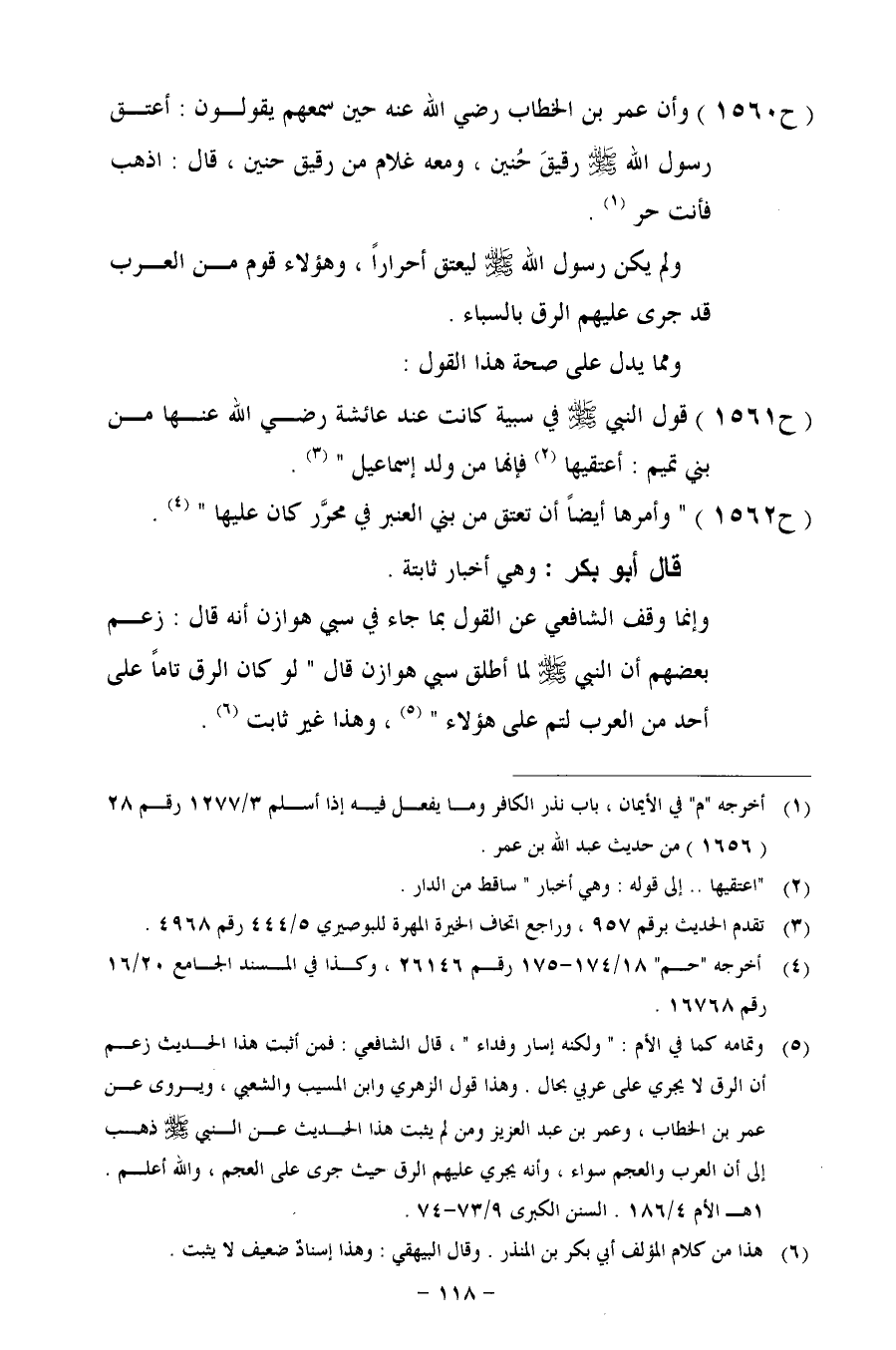 (ح 1560) وأن عمر بن الخطاب رضي الله عنه حين سمعهم يقولون: أعتق رسول الله- صلى الله عليه وسلم - رقيقَ حُنين، ومعه غلام من رقيق حنين، قال: اذهب فأنت حر.