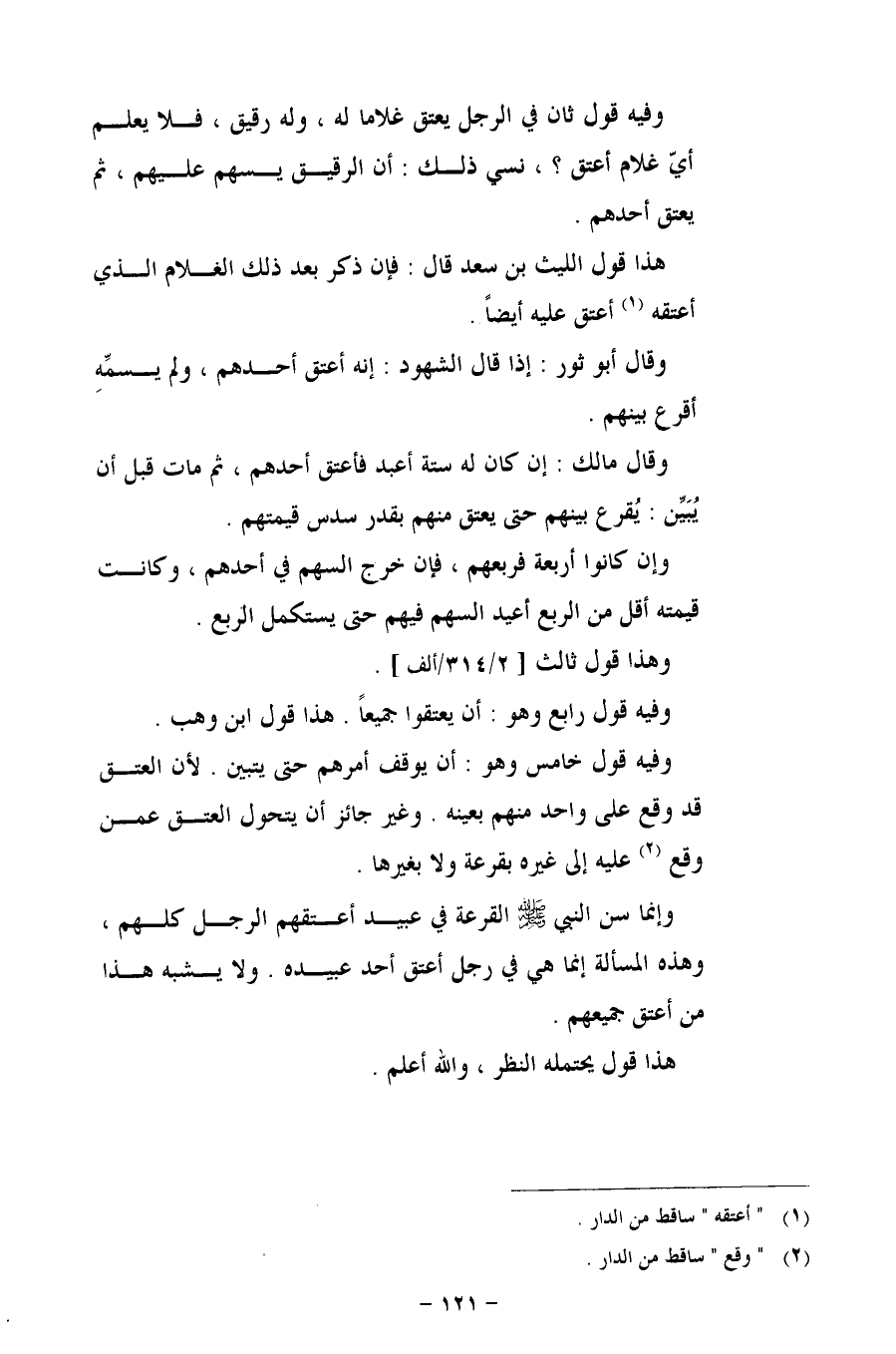 وإنما سن النبي - صلى الله عليه وسلم - القرعة في عبيد أعتقهم الرجل كلهم، وهذه المسألة إنما هي في رجل أعتق أحد عبيده. ولا يشبه هذا من أعتق جميعهم.