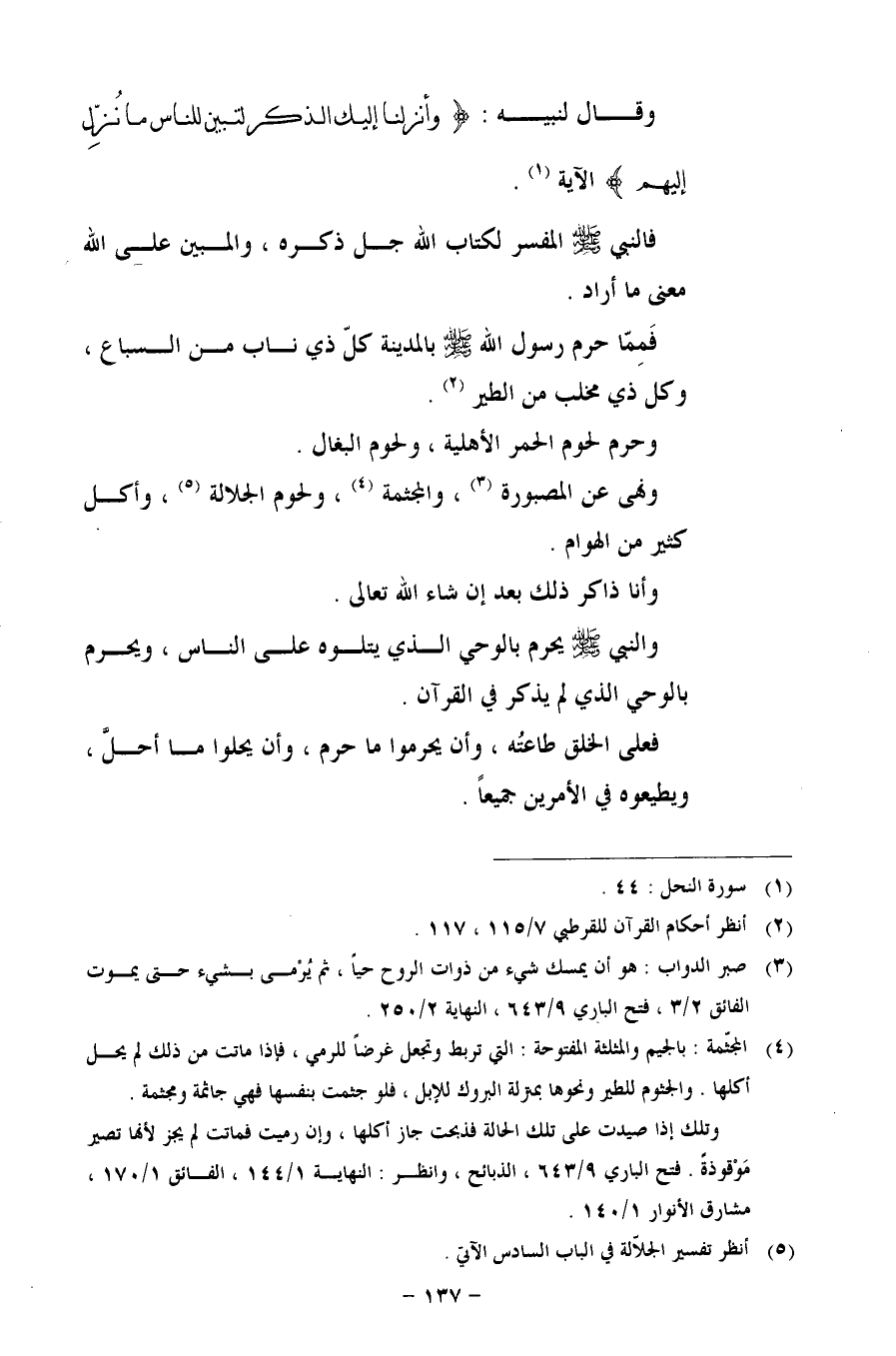 فَمِمّا حرم رسول الله- صلى الله عليه وسلم - بالمدينة كلّ ذي ناب من السباع، وكل ذي مخلب من الطير.