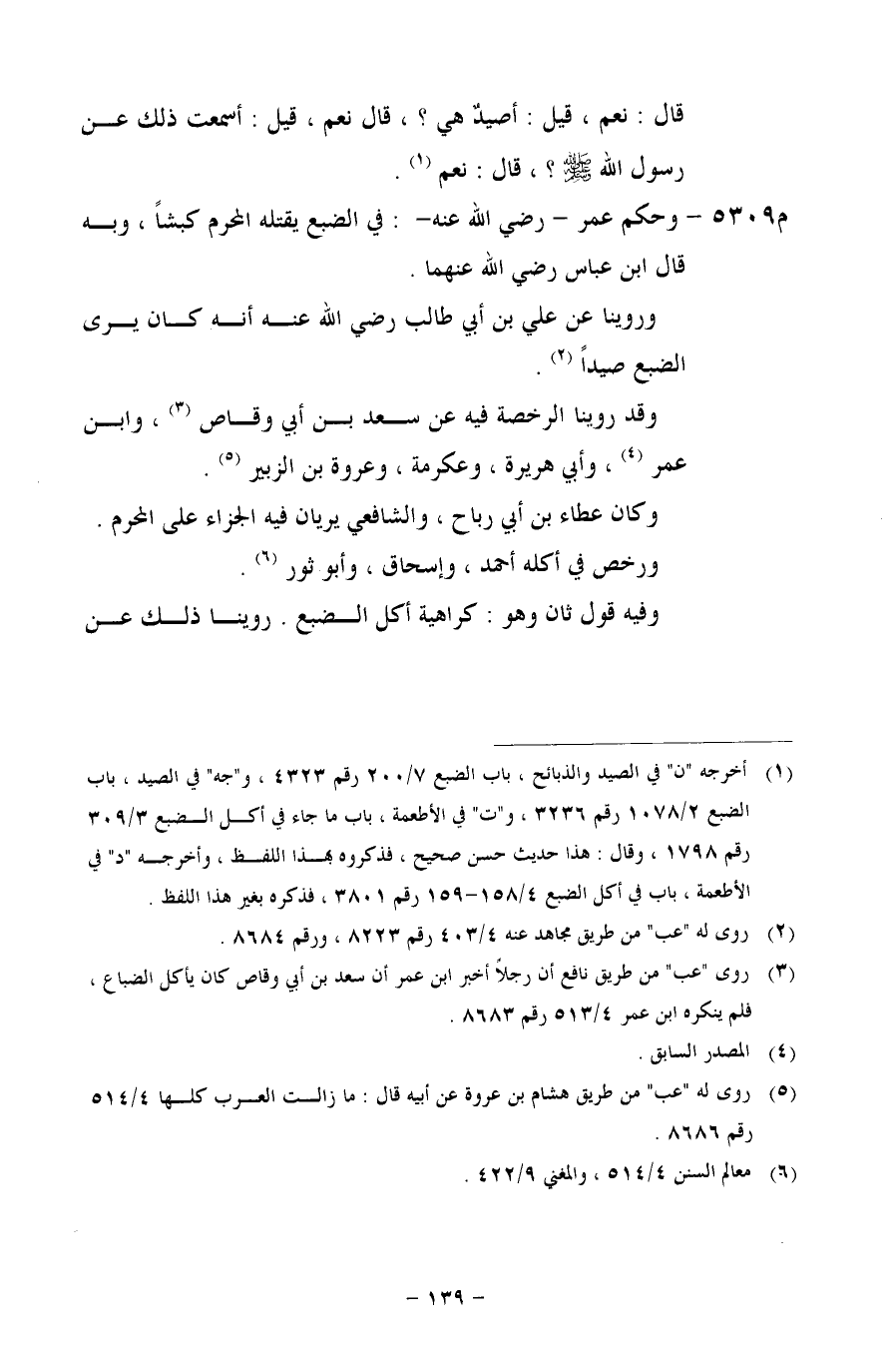 م 5309 - وحكم عمر -رضي الله عنه -: في الضبع يقتله المحرم كبشاً، وبه قال ابن عباس رضي الله عنهما.