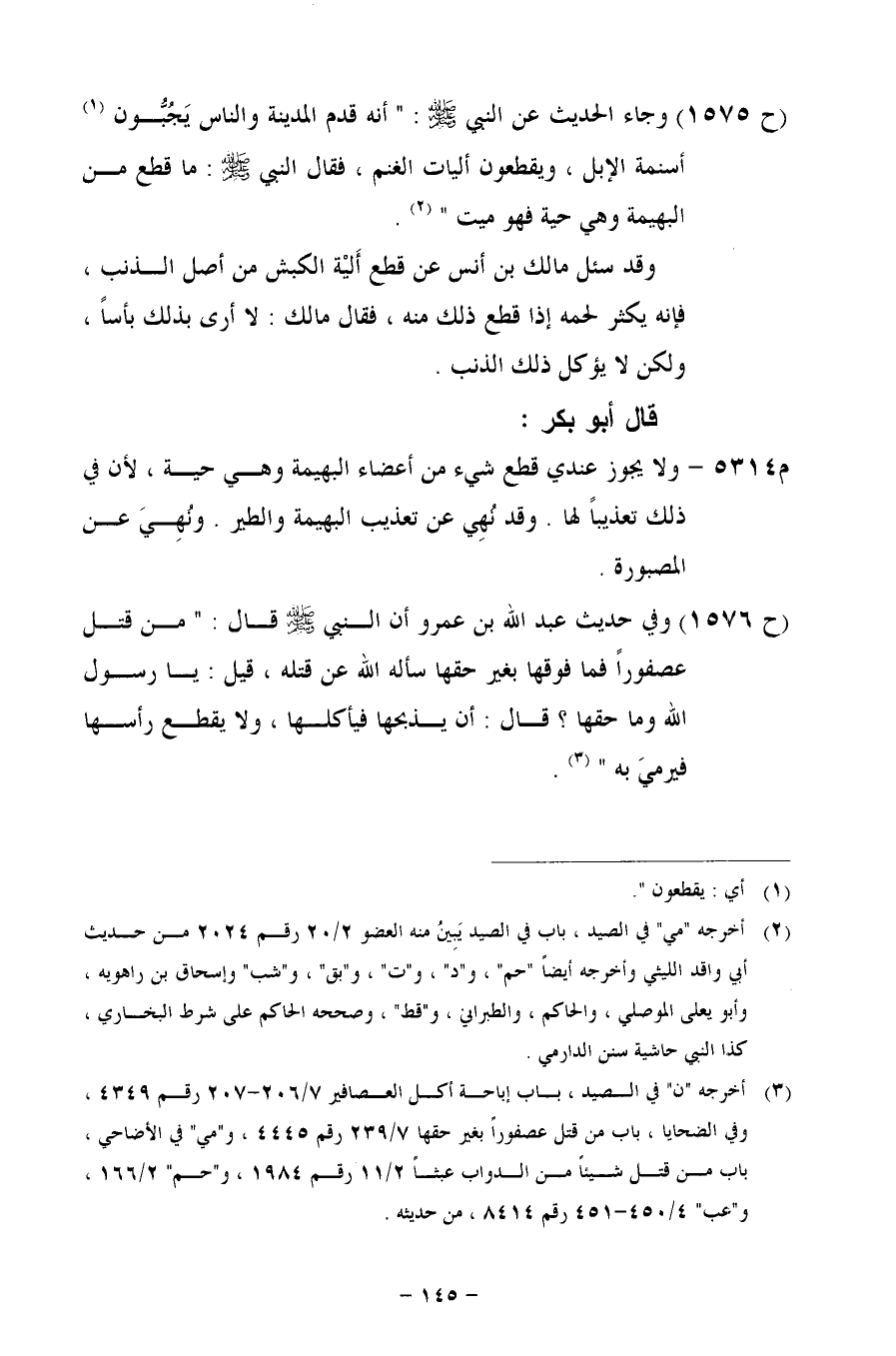 (ح 1575) وجاء الحديث عن النبي: "أنه قدم المدينة والناس يَجُبُّون أسنمة الإبل، ويقطعون أليات الغنم، فقال النبي- صلى الله عليه وسلم - ما قطع من البهيمة وهي حية فهو ميت.