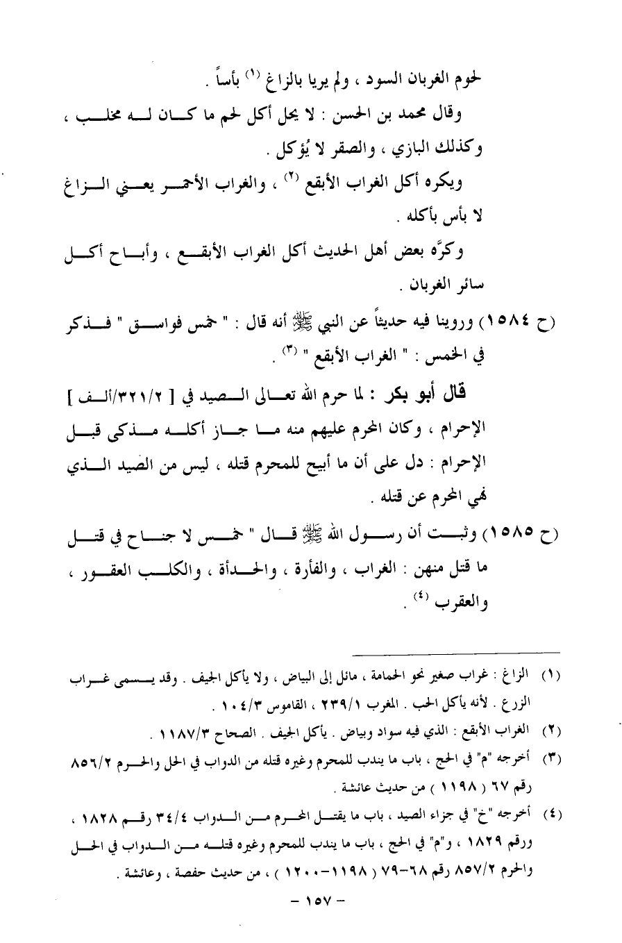 (ح 1584) وروينا فيه حديثاً عن النبي- صلى الله عليه وسلم - أنه قال: "خمس فواسق" فذكر في الخمس: "الغراب الأبقع".