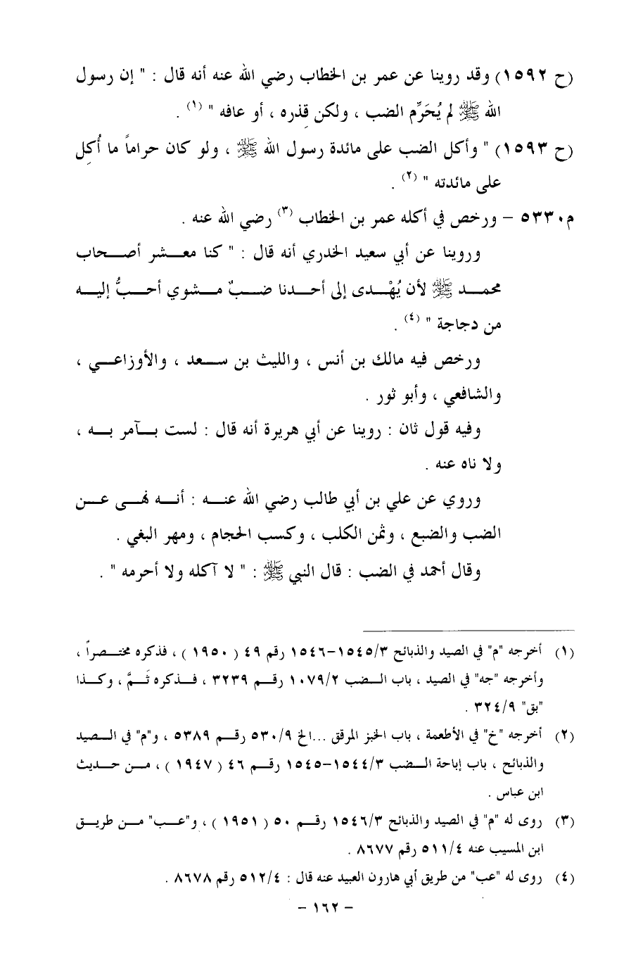(ح 1592) وقد روينا عن عمر بن الخطاب رضي الله عنه أنه قال: "إن رسول الله - صلى الله عليه وسلم - لم يُحَرِّم الضب، ولكن قِذره، أو عافه".