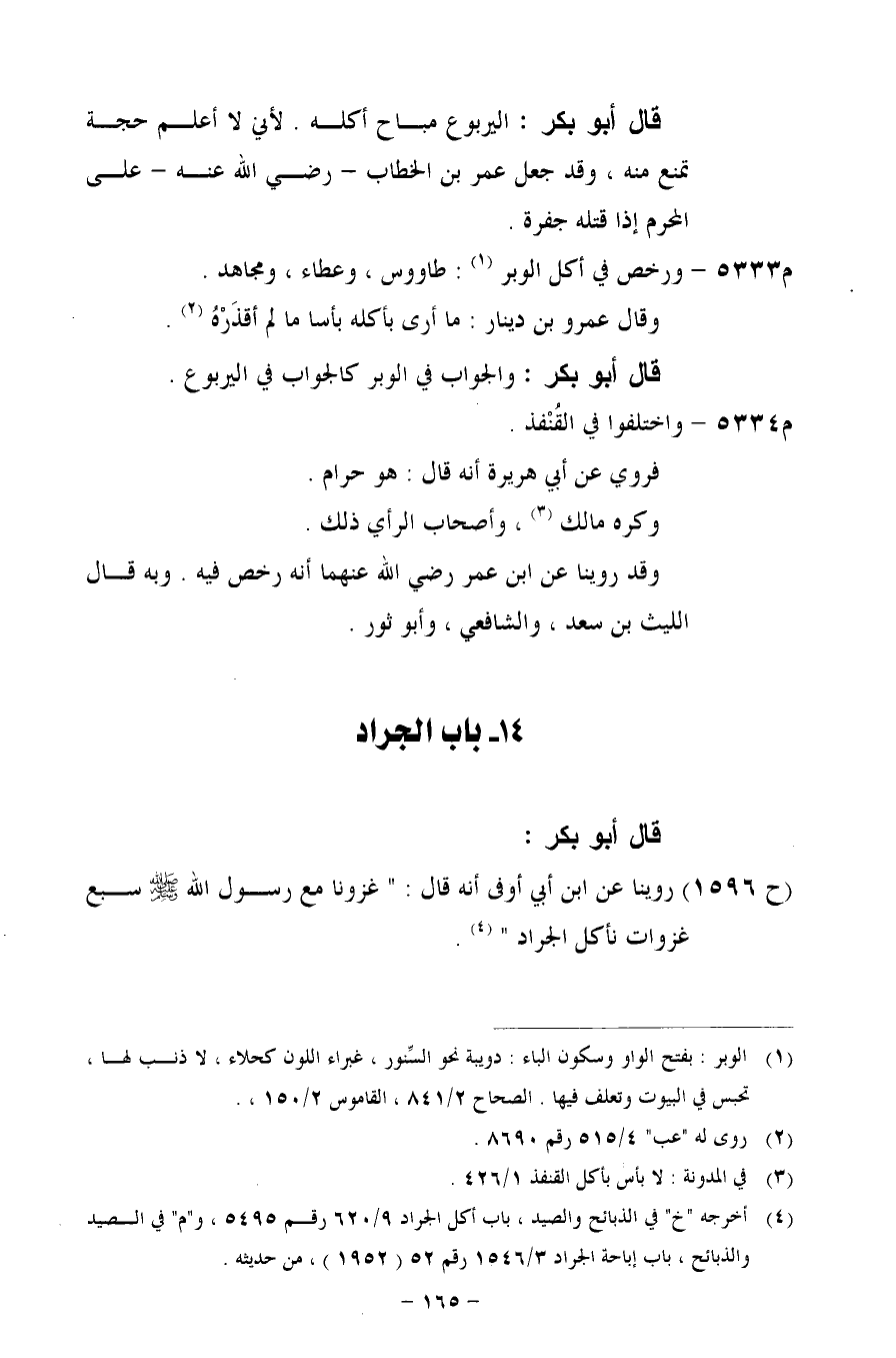 (ح 1596) روينا عن ابن أبي أوفى أنه قال:" غزونا مع رسول الله- صلى الله عليه وسلم - سبع "غزوات نأكل الجراد".