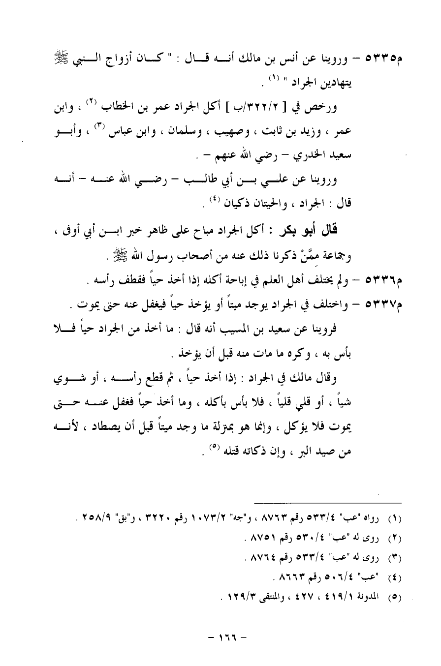 م 5335 - وروينا عن أنس بن مالك أنه قال: "كان أزواج النبي- صلى الله عليه وسلم - يتهادين الجراد".