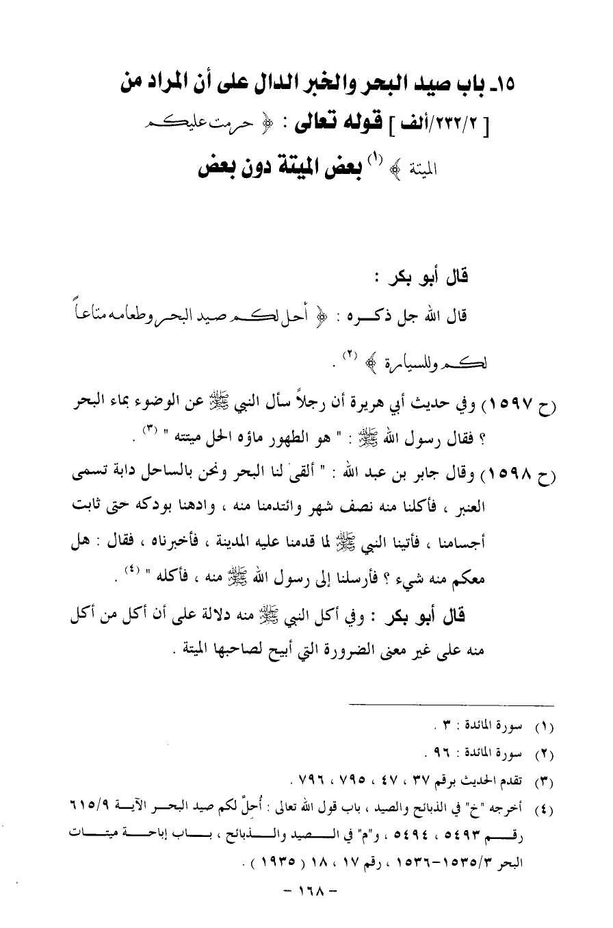 (ح 1597) وفي حديث أبي هريرة أن رجلاً سأل النبي- صلى الله عليه وسلم - عن الوضوء بماء البحر؟ فقال رسول الله- صلى الله عليه وسلم -: "هو الطهور ماؤه الحل ميتته".