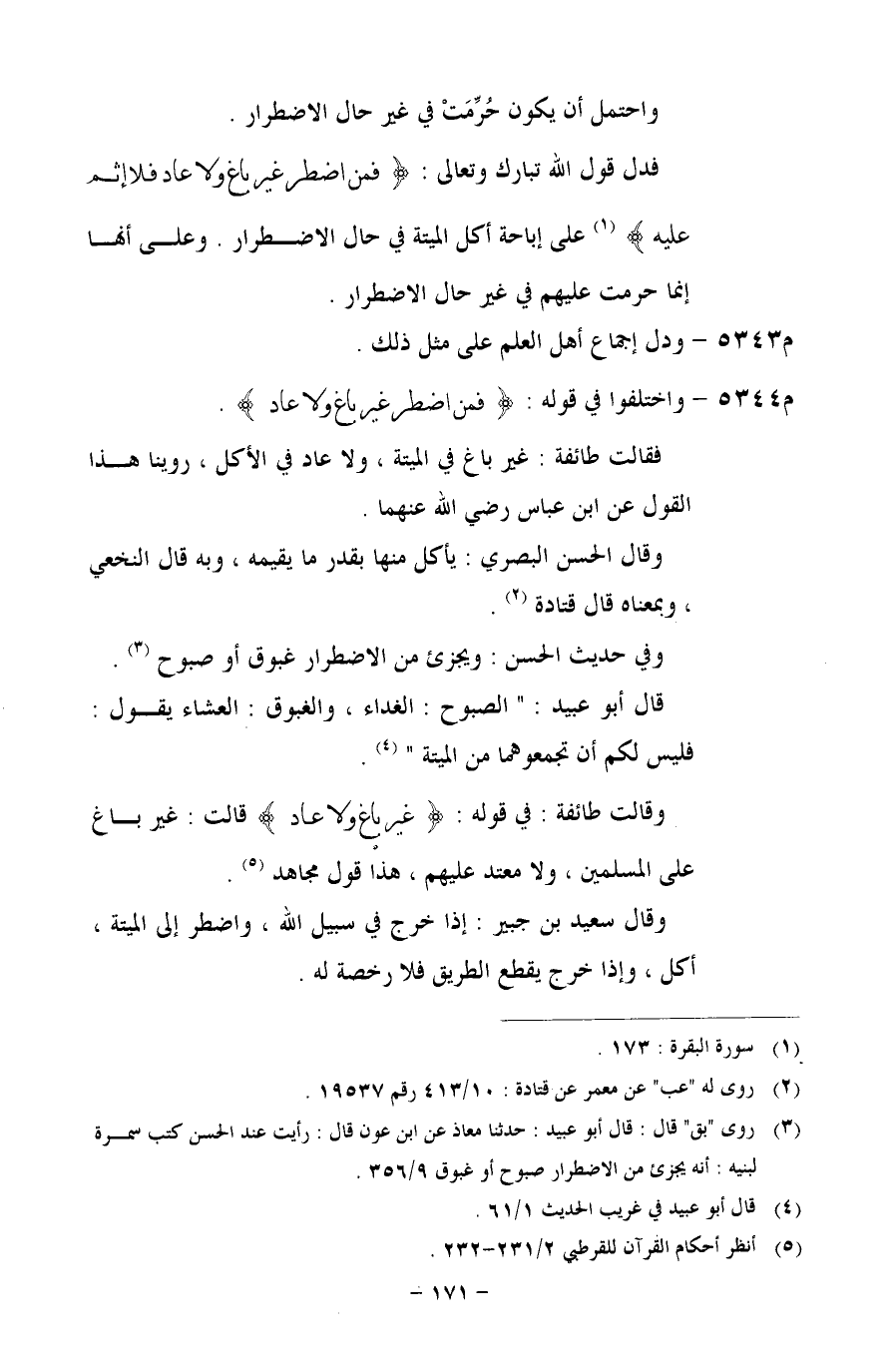 م 5344 - واختلفوا في قوله: {فَمَنِ اضْطُرَّ غَيْرَ بَاغٍ وَلَا عَادٍ} فقالت طائفة: غير باغ في الميتة، ولا عاد في الأكل، روينا هذا القول عن ابن عباس رضي الله عنهما.