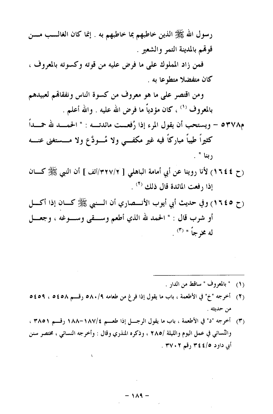 (ح 1645) وفي حديث أبي أيوب الأنصاري أن النبي - صلى الله عليه وسلم - كان إذا أكل أو شرب قال: "الحمد لله الذي أطعم وسقى وسوغه، وجعل له مخرجاً".