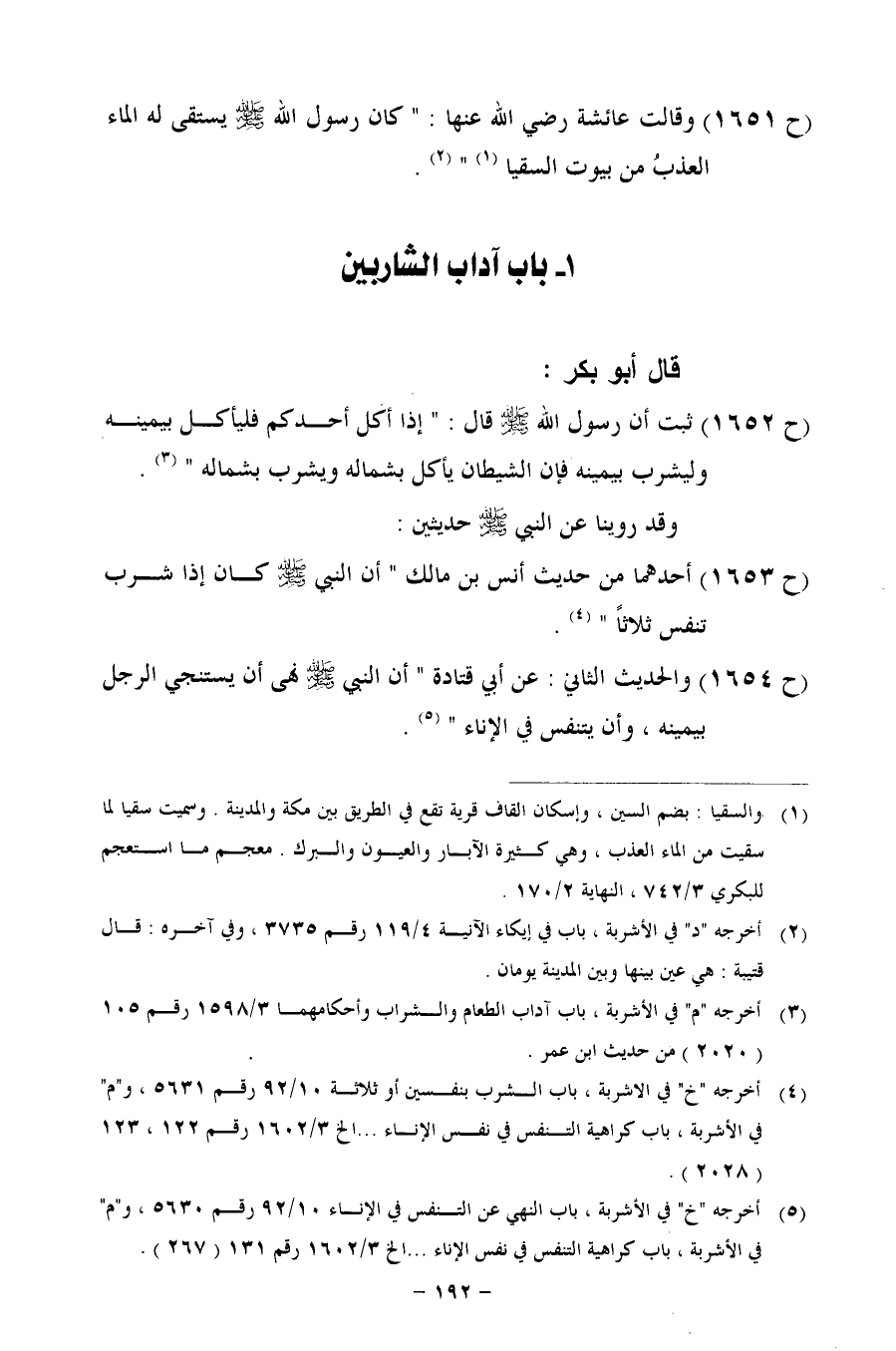(ح 1654) والحديث الثاني: عن أبي قتادة "أن النبي- صلى الله عليه وسلم - نهى أن يستنجي الرجل بيمينه، وأن يتنفس في الإناء".