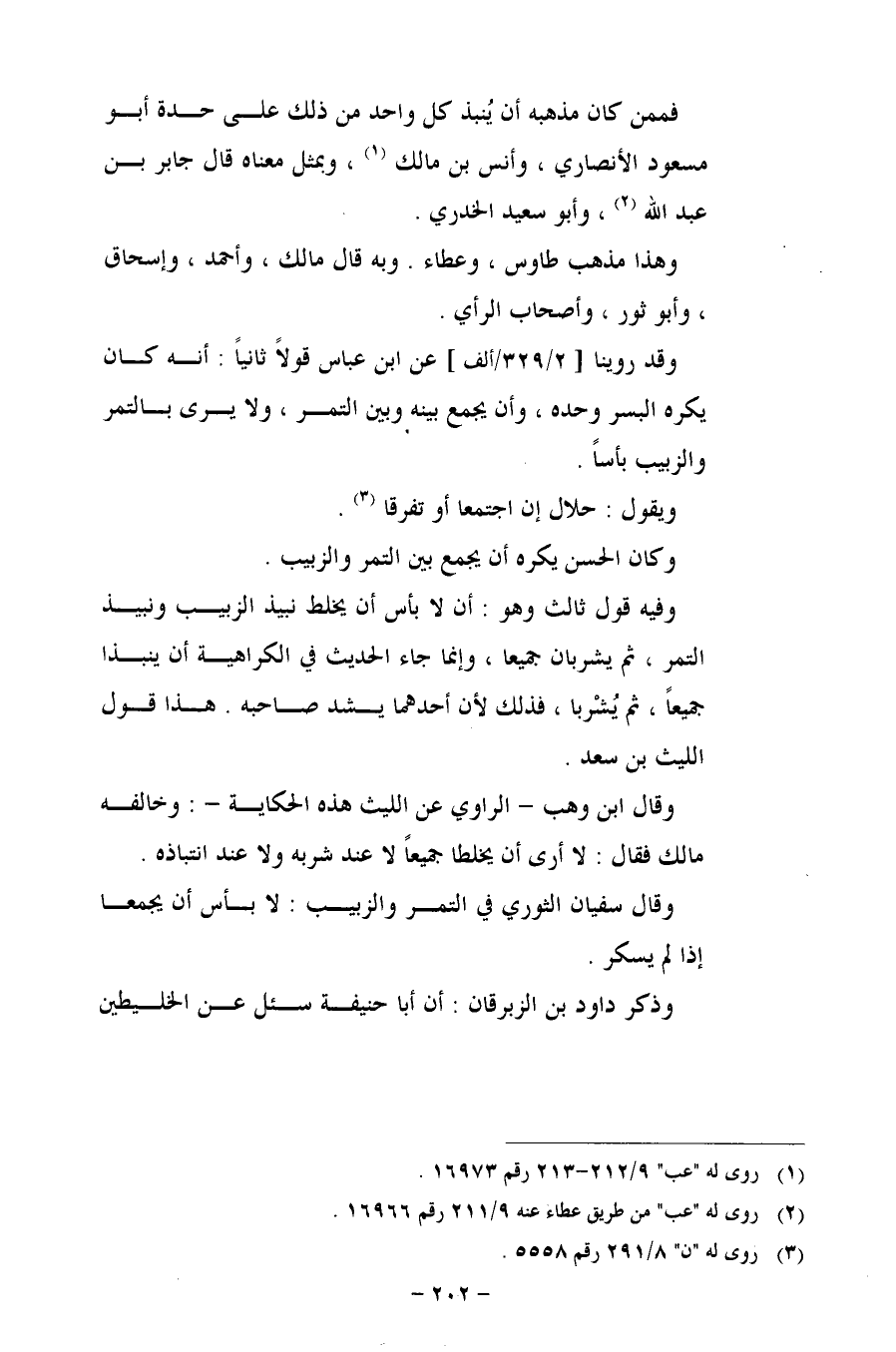 وفيه قول ثالث وهو: أن لا بأس أن يخلطا نبيذ الزبيب ونبيذ التمر، ثم يشربان جميعاً، وإنما جاء الحديث في الكراهية أن ينبذا جميعاً، ثم يُشْربا، فذلك لأن أحدهما يشد صاحبه. هذا قول الليث بن سعد.