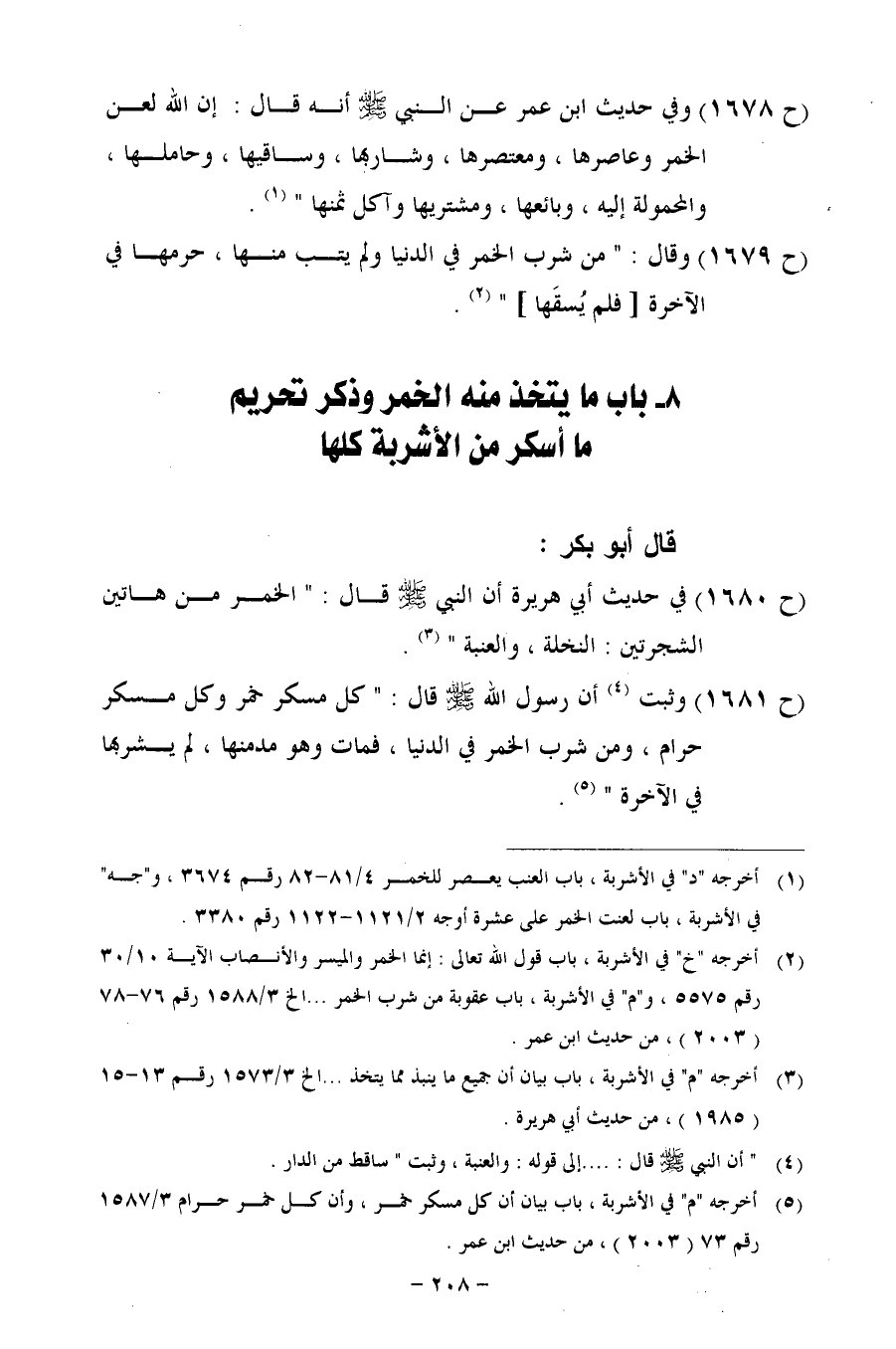 (ح 1678) وفي حديث ابن عمر عن النبي- صلى الله عليه وسلم - أنه قال: إن الله لعن الخمر وعاصرها، ومعتصرها، وشاربها، وساقيها، وحاملها، والمحمولة إليه، وبائعها، ومشتريها وآكل ثمنها".