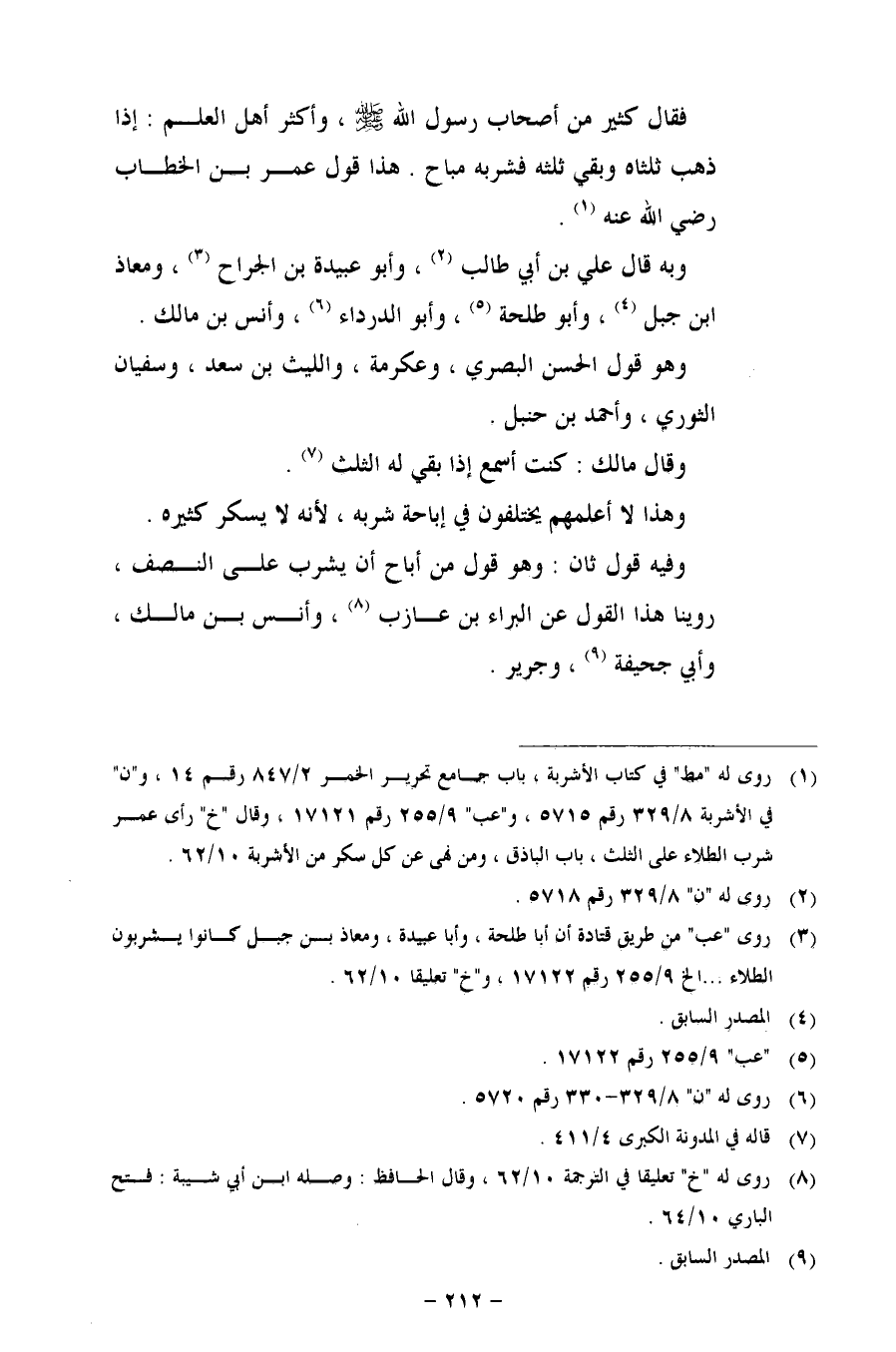 فقال كثير من أصحاب رسول الله- صلى الله عليه وسلم - وأكثر أهل العلم: إذا ذهب ثلثاه وبقي ثلثه فشربه مباح. هذا قول عمر بن الخطاب رضي الله عنه.