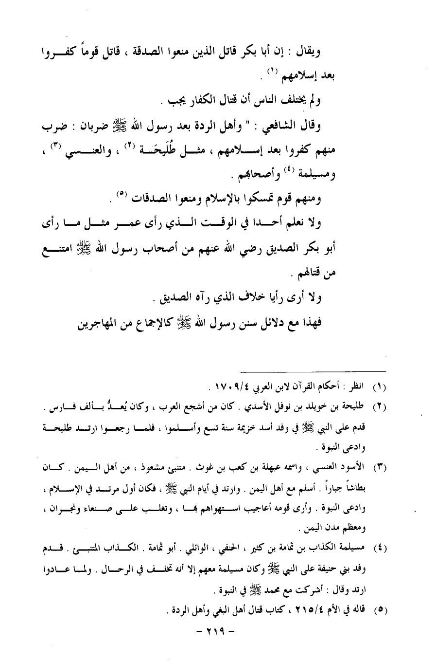 وقال الشافعي: "وأهل الردة بعد رسول الله- صلى الله عليه وسلم - ضربان: ضرب منهم كفروا بعد إسلامهم، مثل طُلَيحَة، والعنسي، ومسيلمة وأصحابهم.
