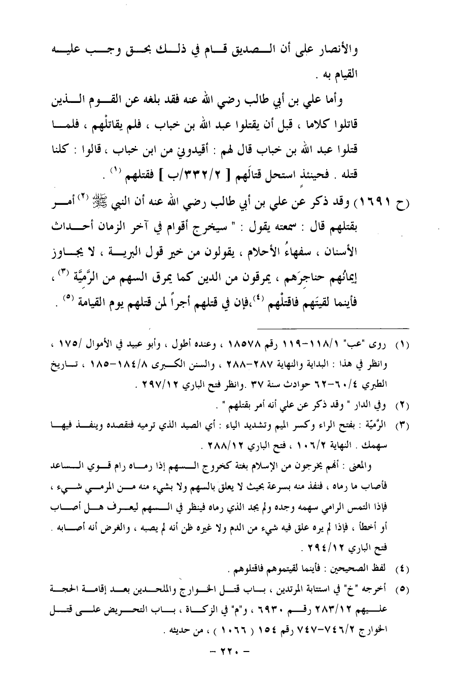 (ح 1691) وقد ذكر عن علي بن أبي طالب رضي الله عنه أن النبي - صلى الله عليه وسلم - (¬1) أمر بقتلهم قال: سمعته يمول: "سيخرج أقوام في آخر الزمان أحداث الأسنان، سفهاءُ الأحلام، يقولون من خير قول البرية، لا يجاوز إيمانُهم حناجِرَهم، يمرقون من الدين كما يمرق السهم من الرَّمِيَّة،