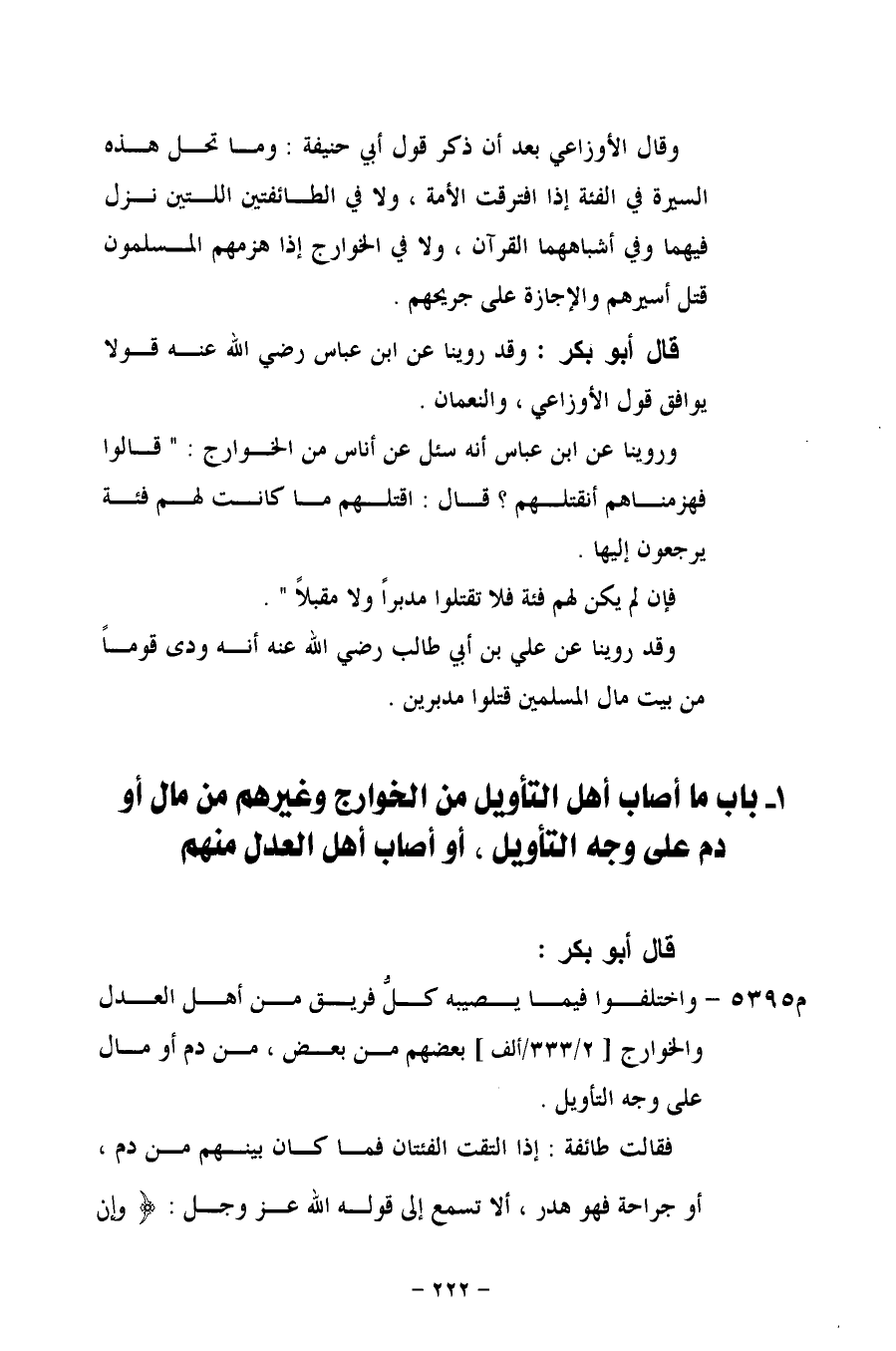 1 - باب ما أصاب أهل التأويل من الخوارج وغيرهم من مال أو دم على وجه التأويل، أو أصاب أهل العدل منهم
