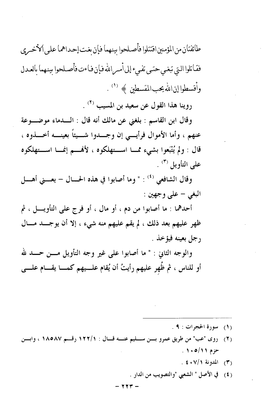 طَائِفَتَانِ مِنَ الْمُؤْمِنِينَ اقْتَتَلُوا فَأَصْلِحُوا بَيْنَهُمَا فَإِنْ بَغَتْ إِحْدَاهُمَا عَلَى الْأُخْرَى فَقَاتِلُوا الَّتِي تَبْغِي حَتَّى تَفِيءَ إِلَى أَمْرِ اللَّهِ فَإِنْ فَاءَتْ فَأَصْلِحُوا بَيْنَهُمَا بِالْعَدْلِ وَأَقْسِطُوا إِنَّ اللَّهَ يُحِبُّ الْمُقْسِطِينَ}.
