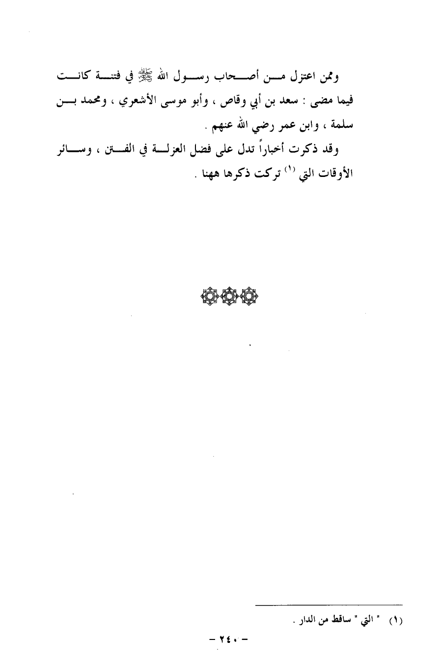 وممن اعتزل من أصحاب رسول الله-صلى الله عليه وسلم- في فتنة كانت فيما مضى: سعد بن أبي وقاص، وأبو موسى الأشعري، ومحمد بن سلمة، وابن عمر رضي الله عنهم.