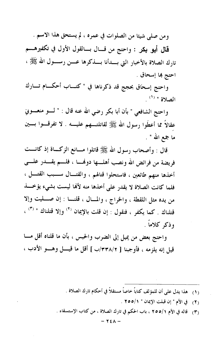 قال أبو بكر: واحتج من قال بالقول الأول في تكفيرهم تارك الصلاة بالأخبار التي بدأنا بذكرها عن رسول الله- صلى الله عليه وسلم -، احتج بها إسحاق.