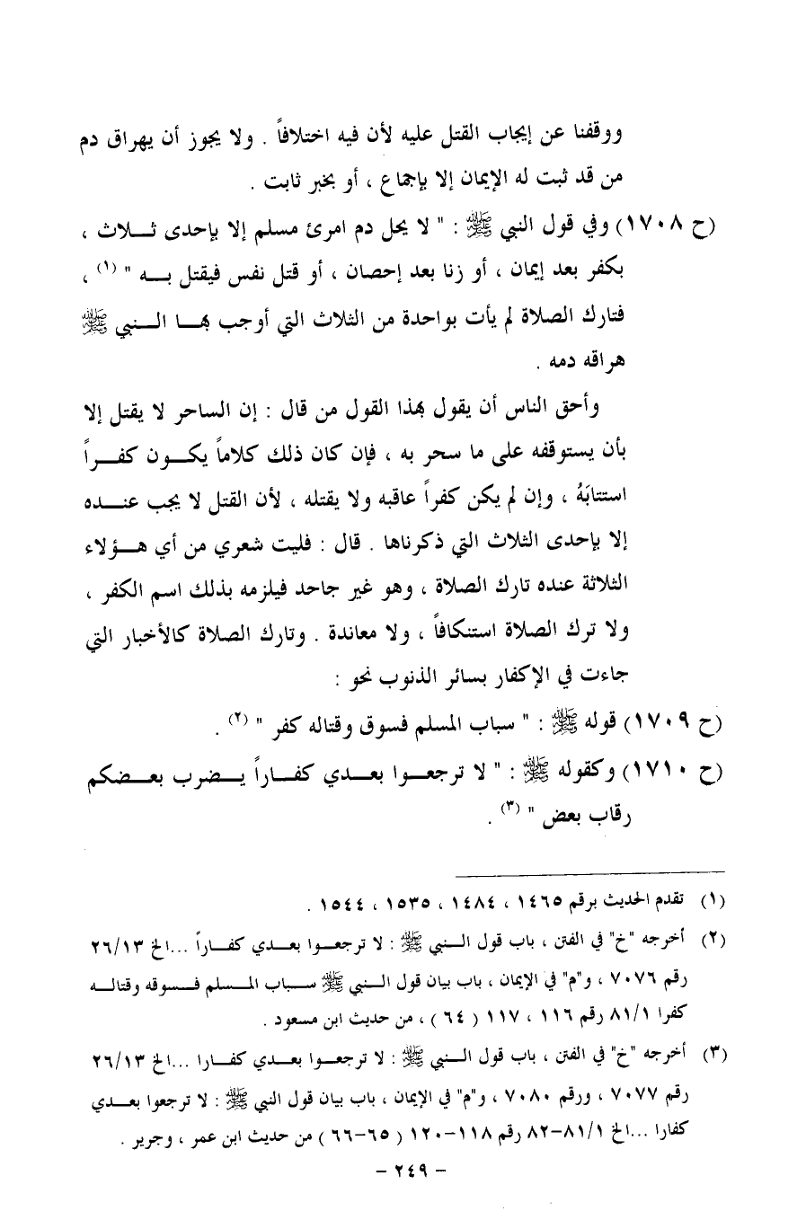 (ح 1710) وكقوله - صلى الله عليه وسلم -: "لا ترجعوا بعدي كفاراً يضرب بعضكم رقاب بعض".