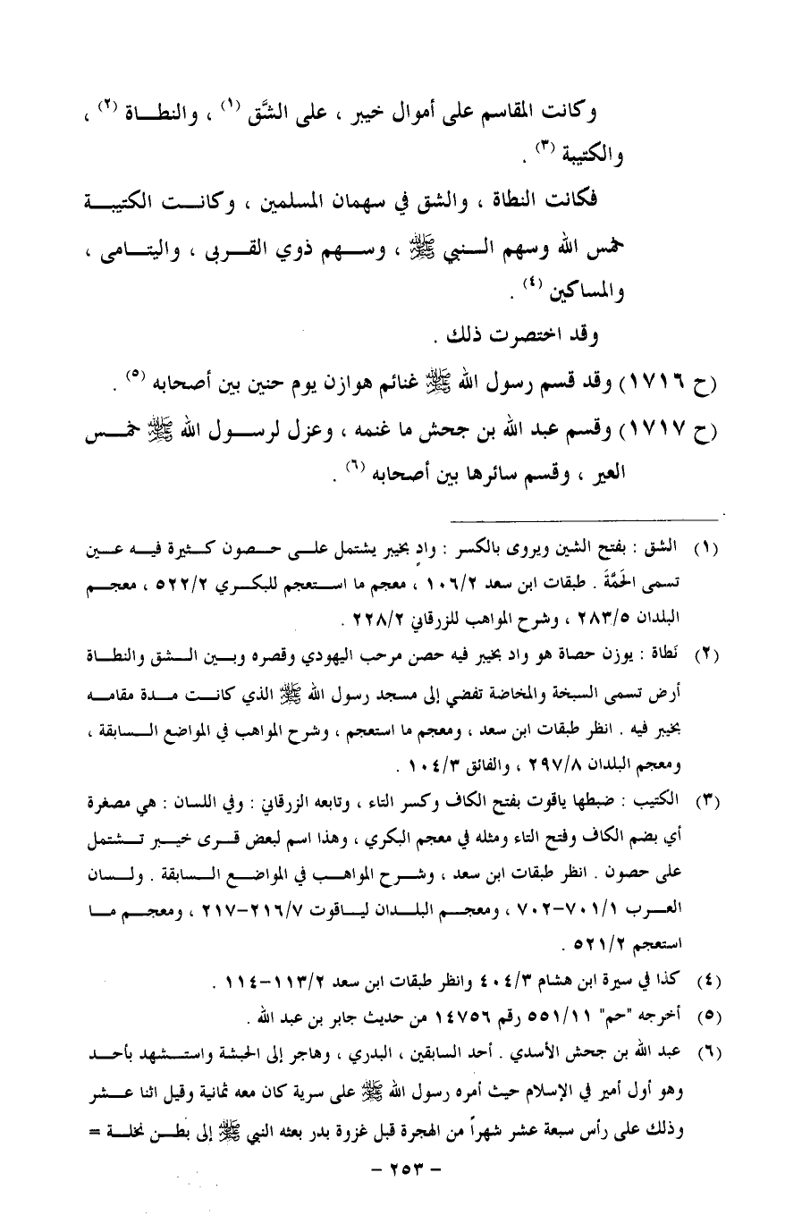 فكانت النطاة، والشق في سهمان المسلمين، وكانت الكتيبة خمس الله وسهم النبي - صلى الله عليه وسلم -، وسهم ذوي القربى، واليتامى، والمساكين.